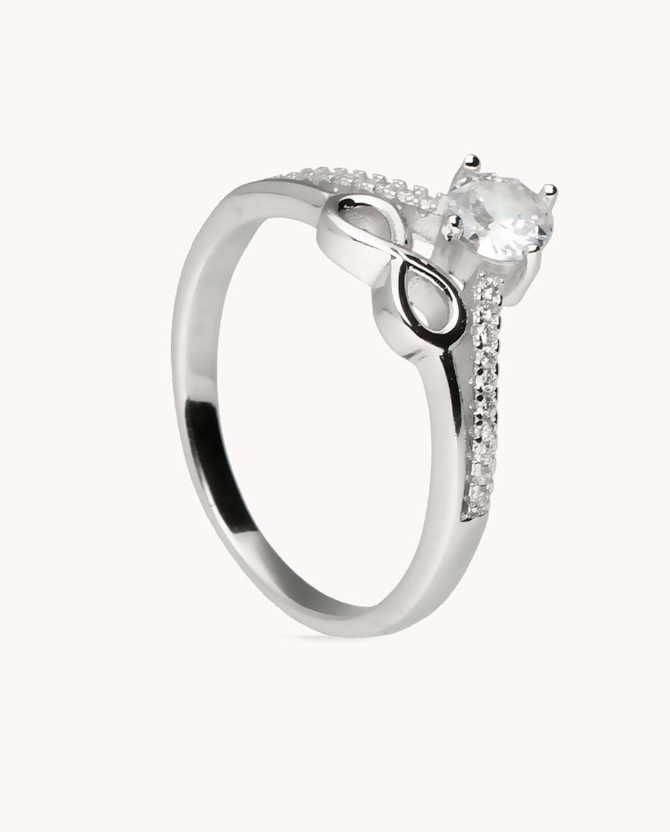 Anillo doble de plata de ley 925 bañado en rodio, compuesto por un infinito y solitario con circonita central blanca de 5 mm engastada en cuatro garras y circonitas laterales blancas.
