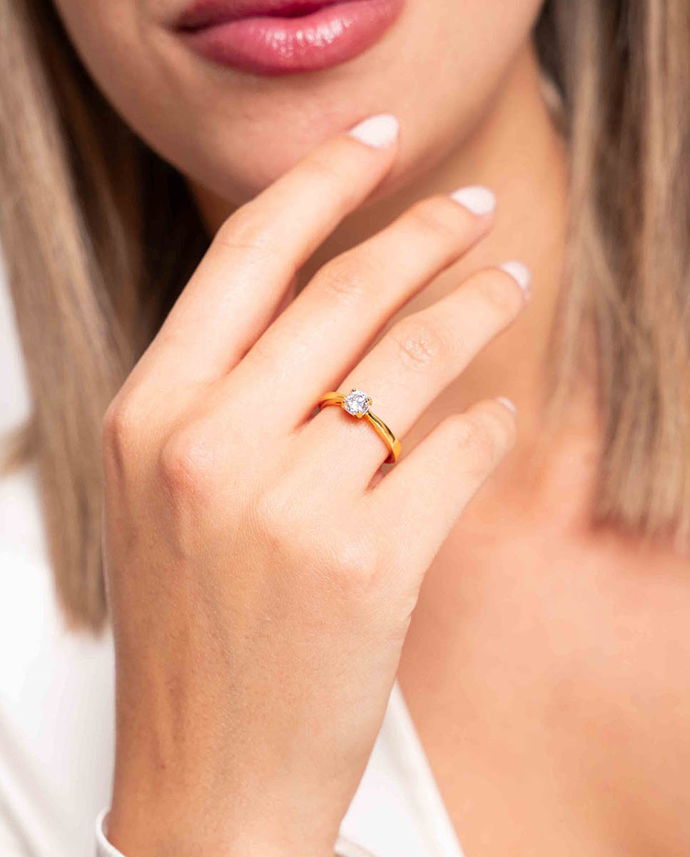 Anillo de plata de ley 925 bañada en oro 18K tipo solitario con circonita redonda central de 5 mm de diámetro engastada en cuatro garras.