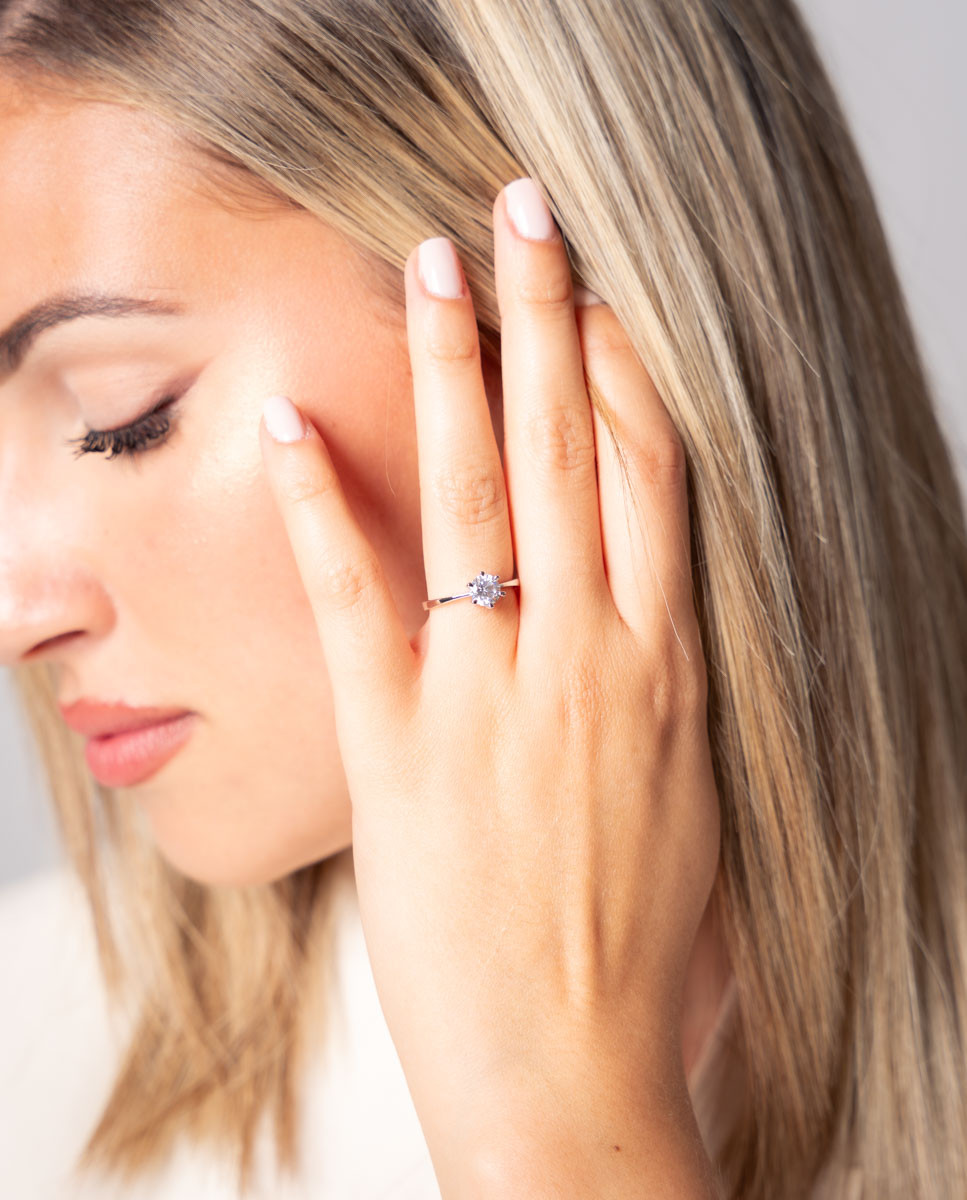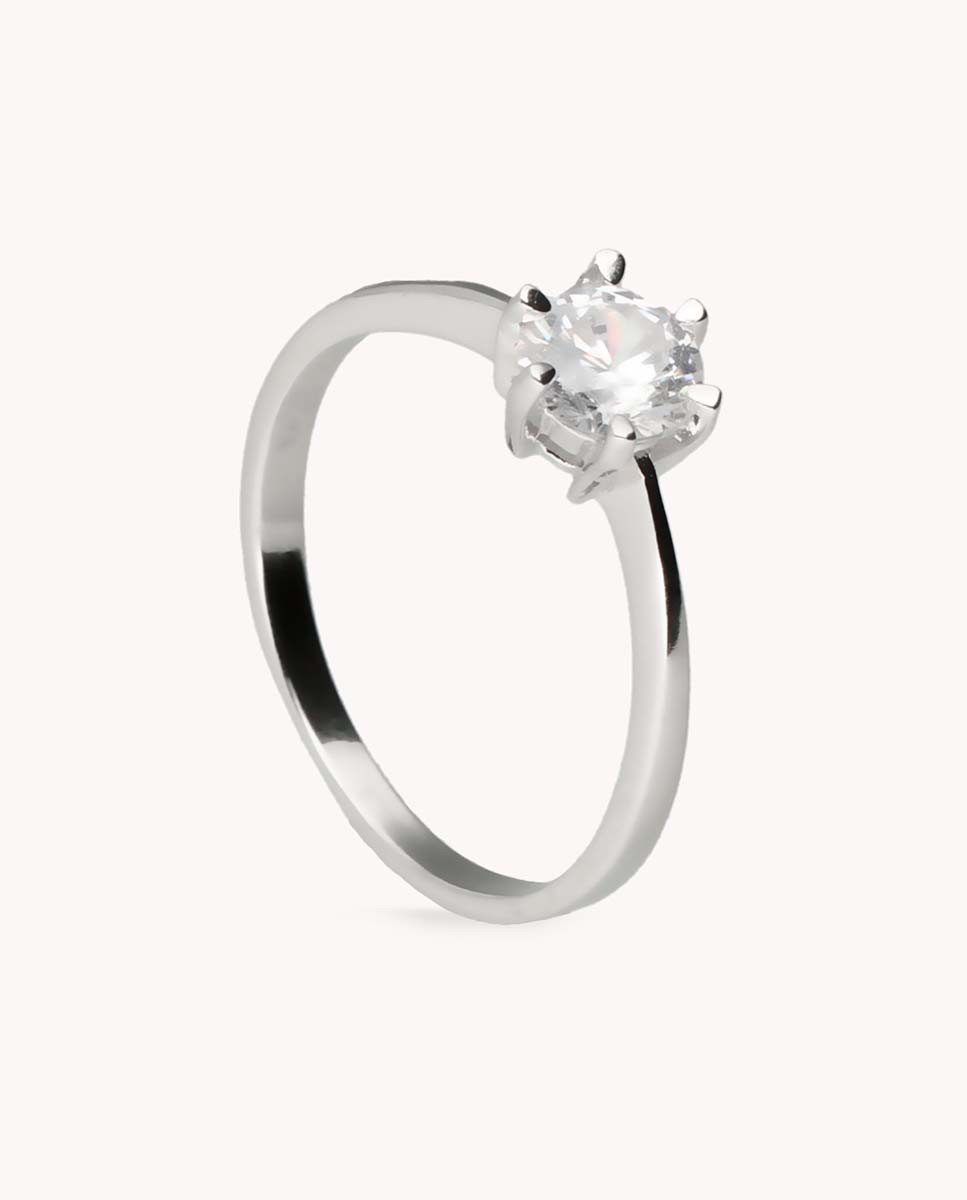 Anillo de plata de ley 925 bañada en rodio tipo solitario con circonita redonda central de 5 mm engastada en seis garras.