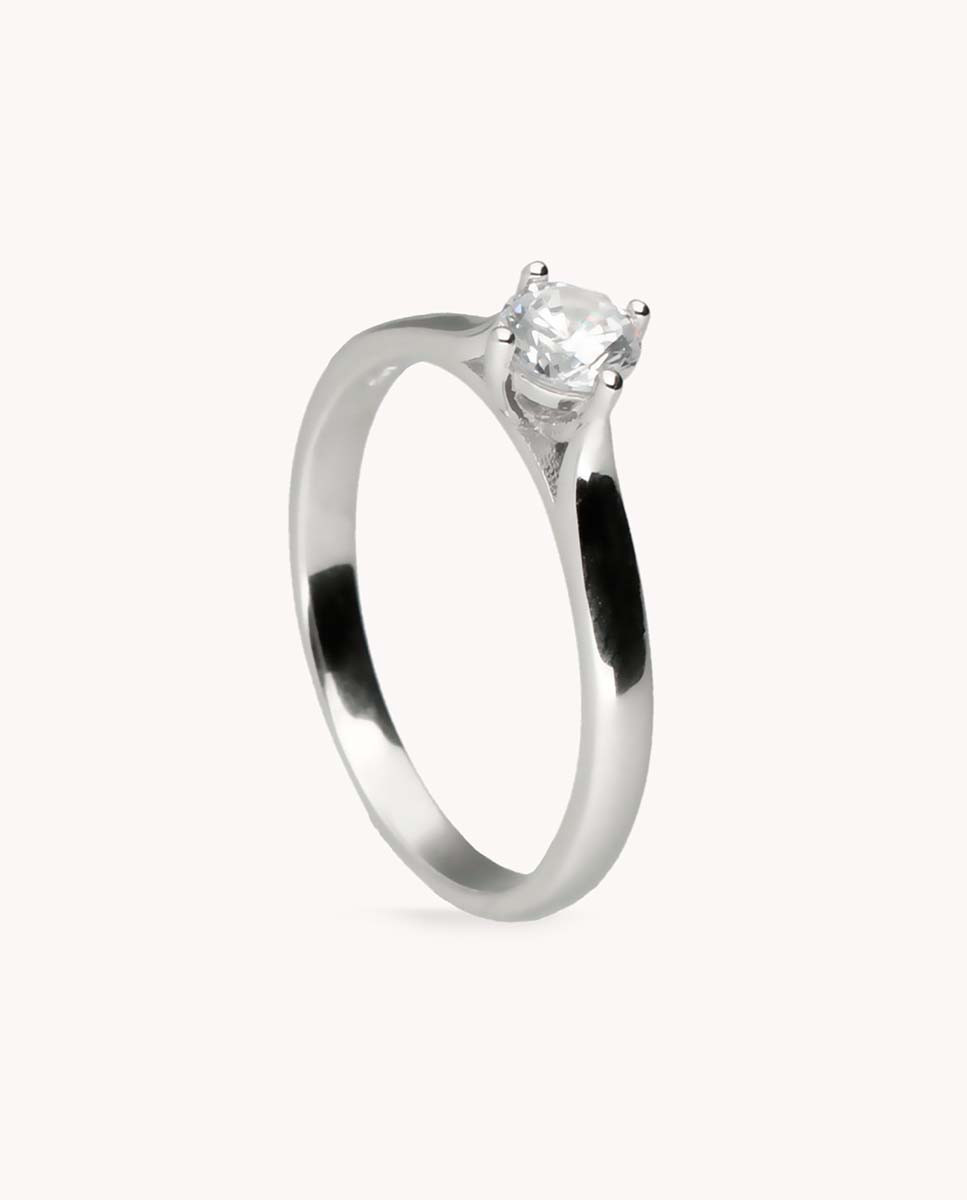 Anillo de plata de ley 925 bañada en rodio tipo solitario con circonita redonda central de 5 mm engastada en cuatro garras.