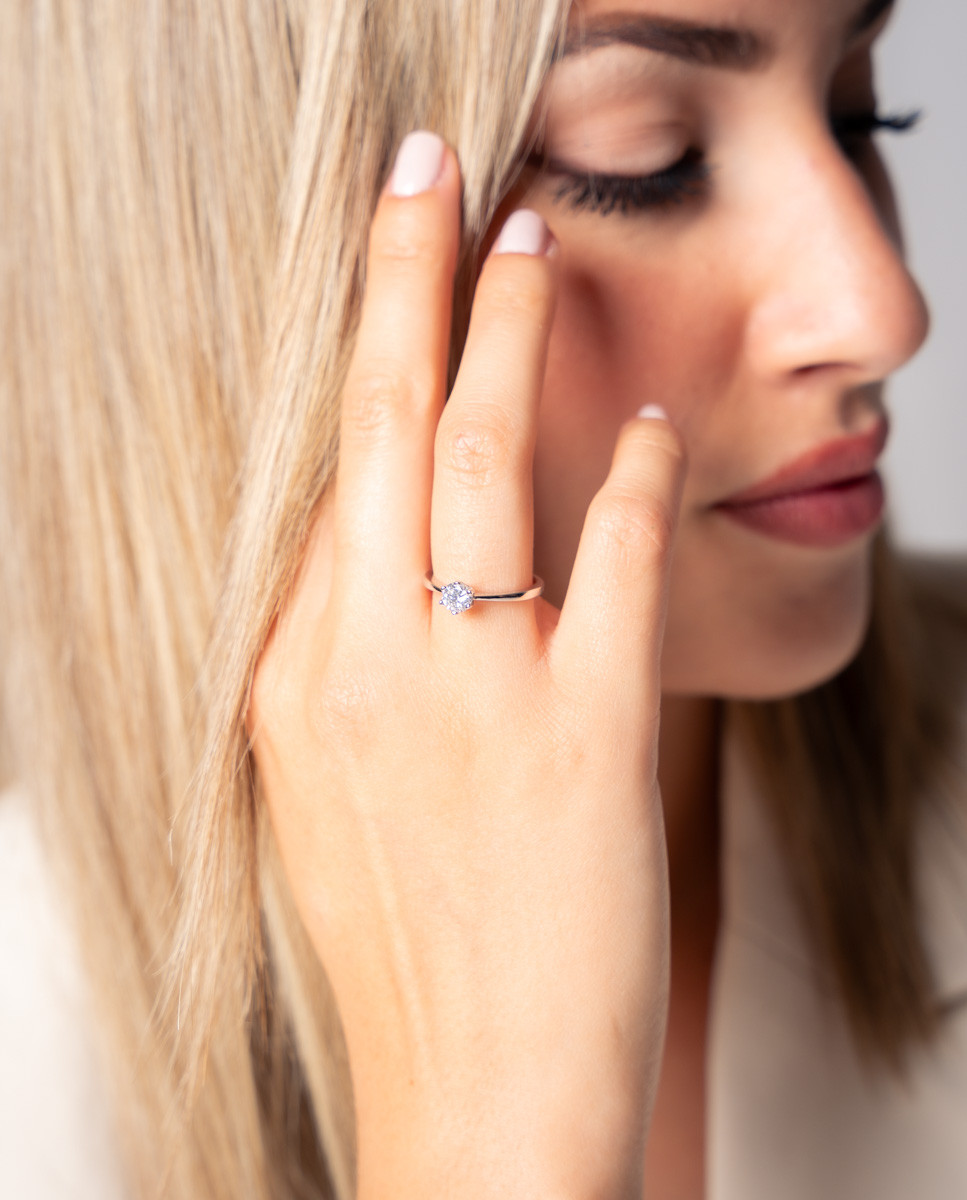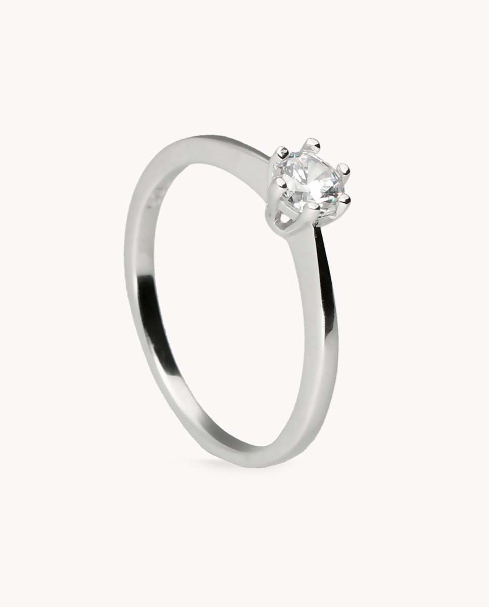 Anillo de plata de ley 925 bañada en rodio tipo solitario con circonita redonda central de 5 mm engastada en seis garras.