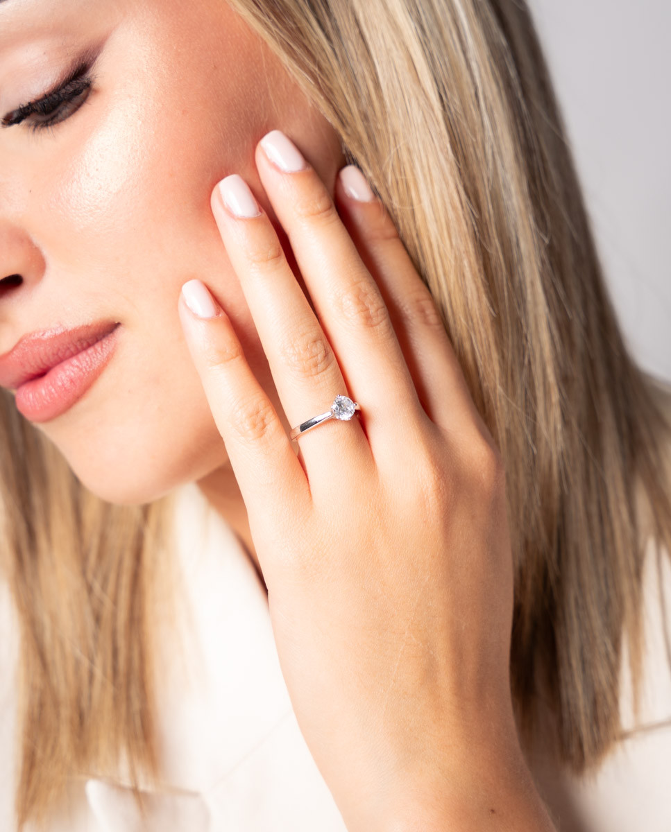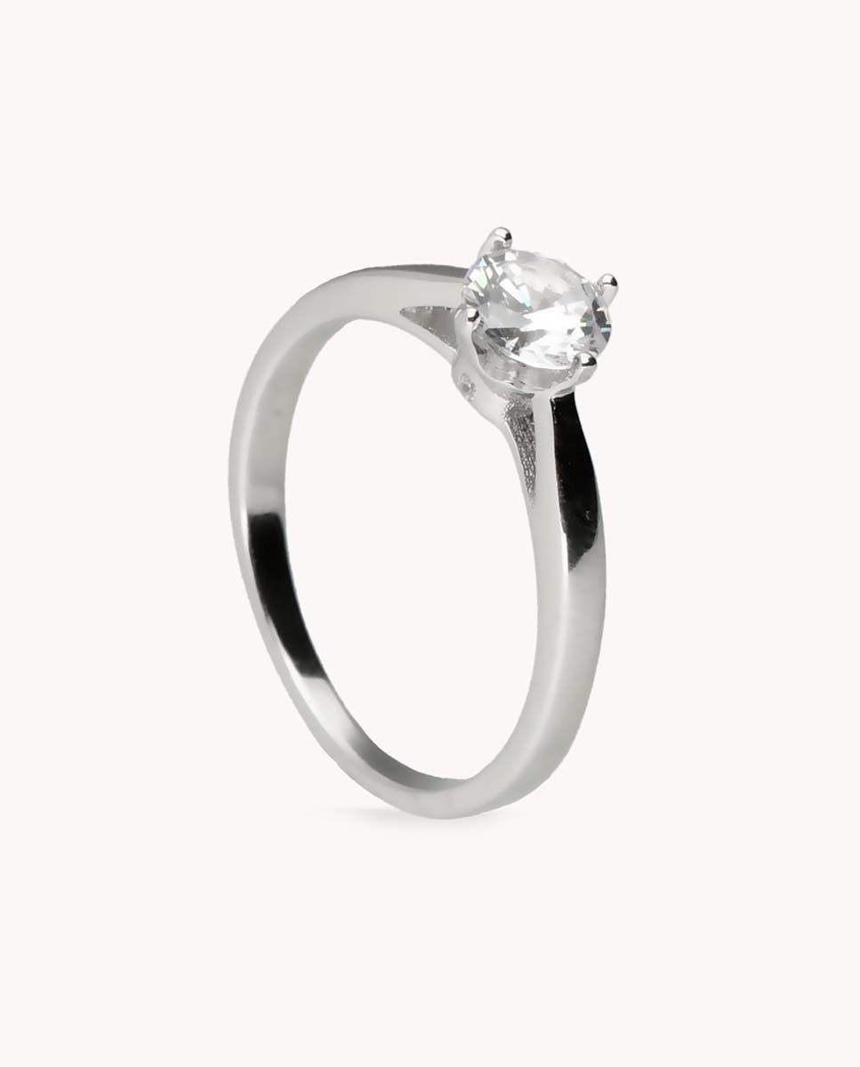 Anillo de plata de ley 925 bañada en rodio tipo solitario con circonita redonda central de 6 mm engastada en cuatro garras.