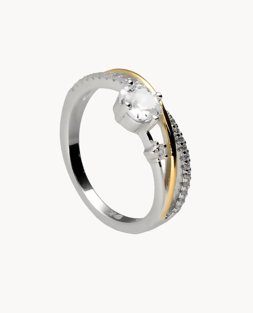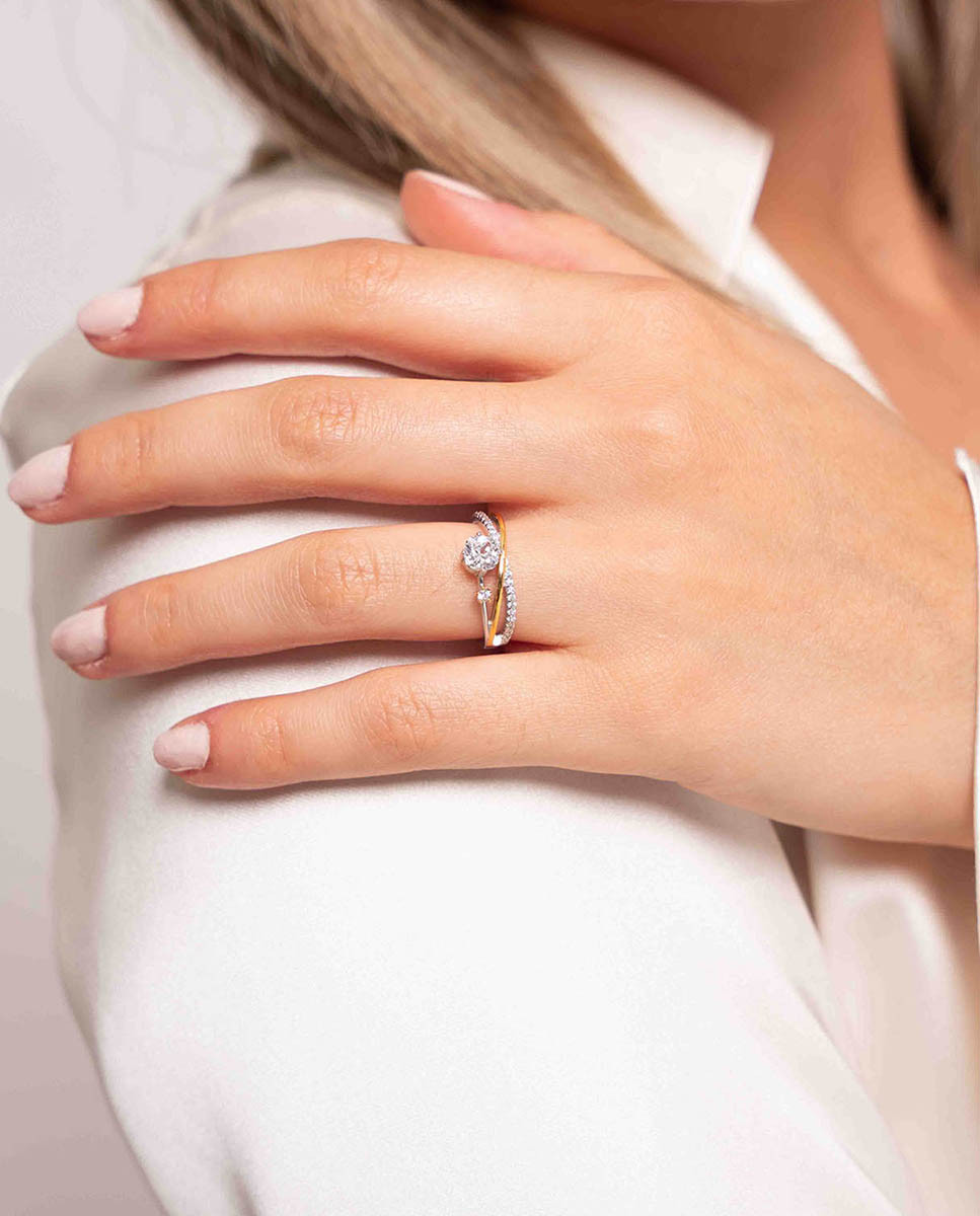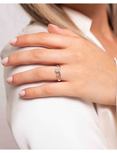 Anillo bicolor de plata de ley 925 bañada en rodio y oro 18K tipo solitario con circonita redonda central de 5 mm de diámetro engastada en cuatro garras y en un lateral circonita redonda de 2 mm de diámetro engastada en 5 garras.