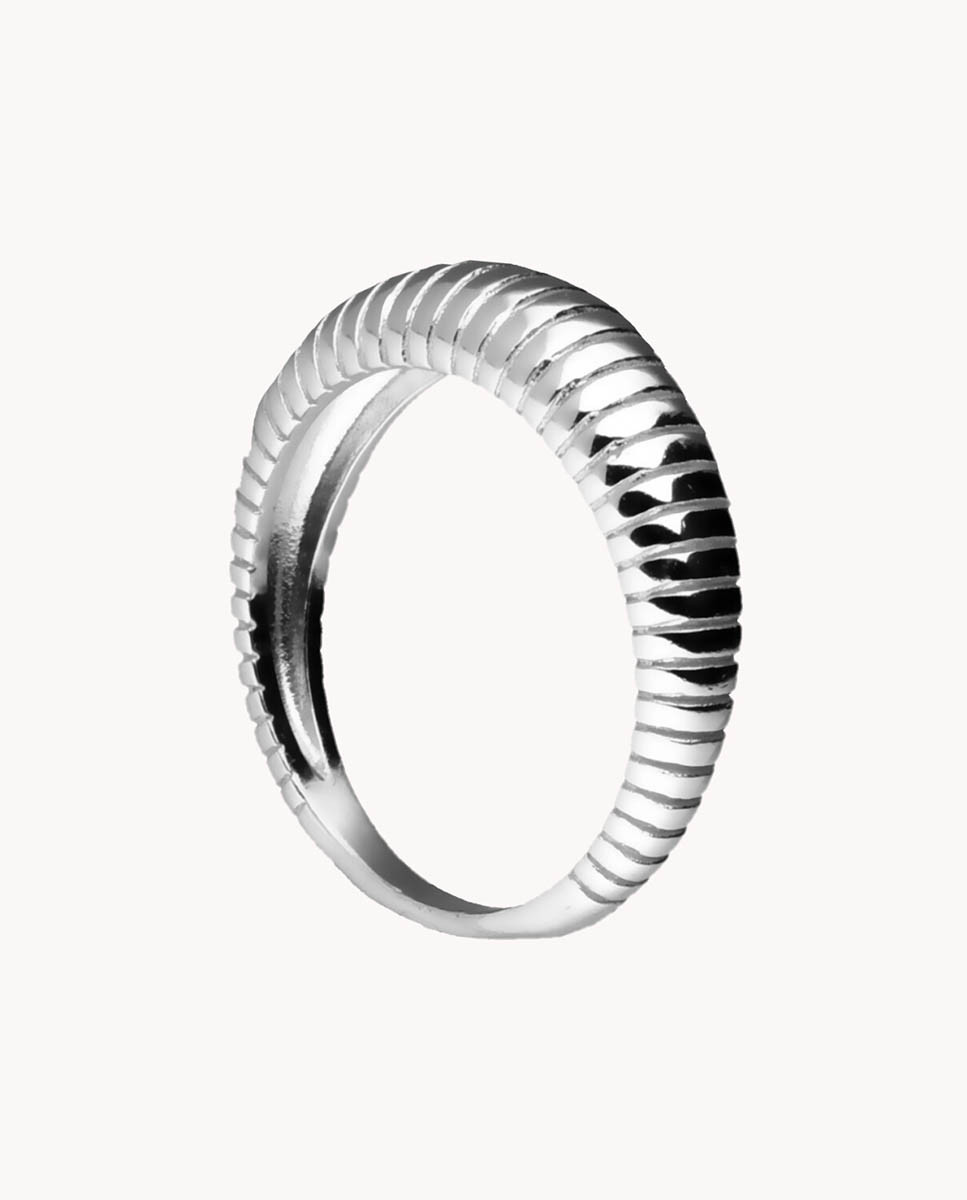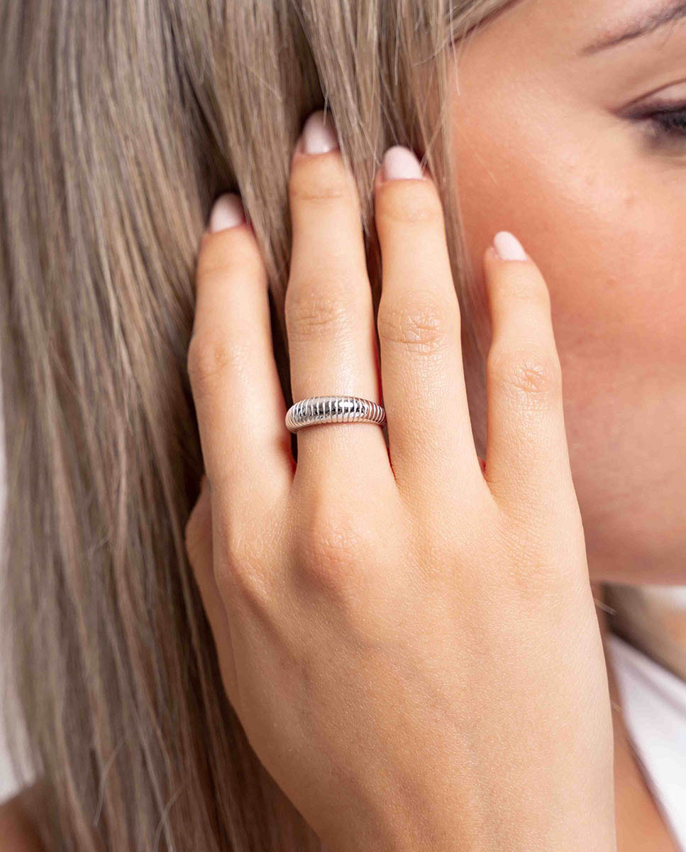 Anillo de plata de ley 925 bañada en rodio con textura en la mitad superior.
