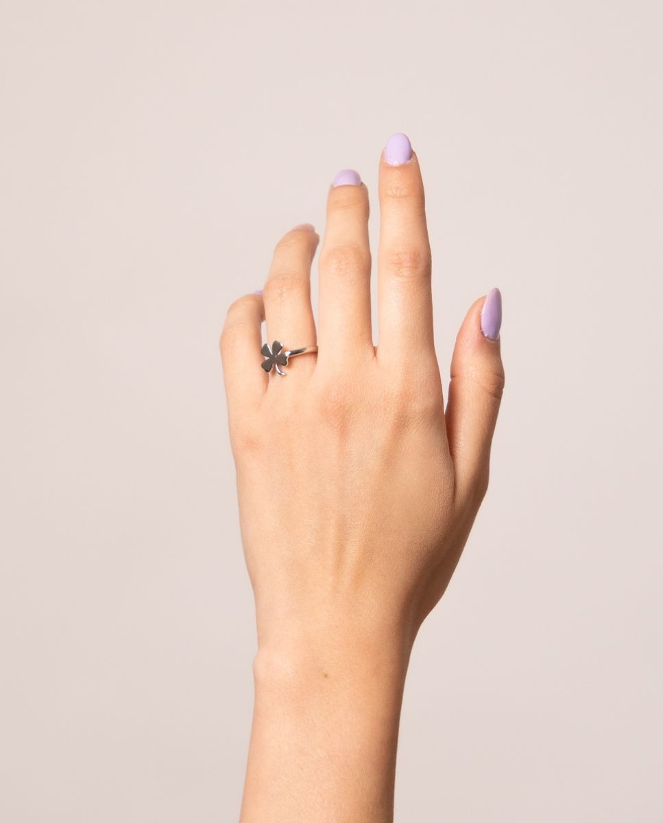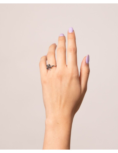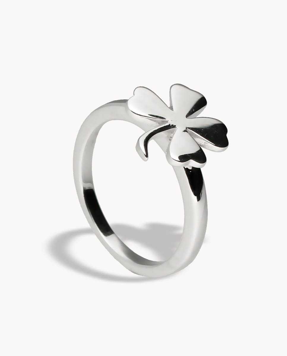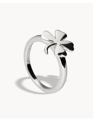 Anillo de plata de ley 925 bañado en rodio con motivo trébol, cuatro hojas.