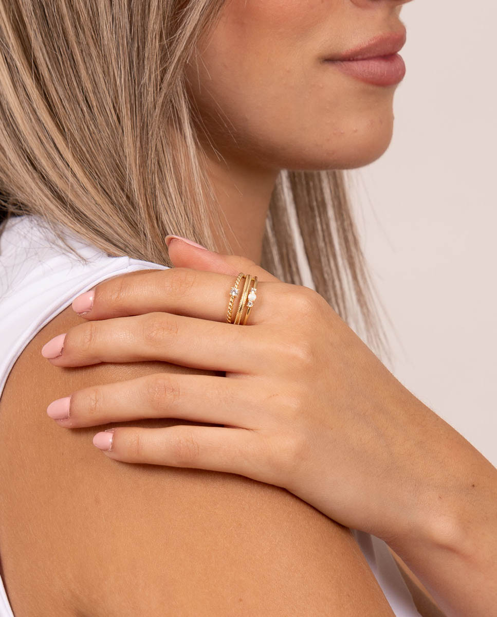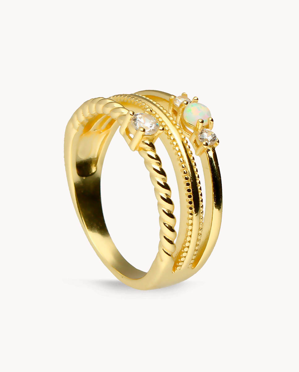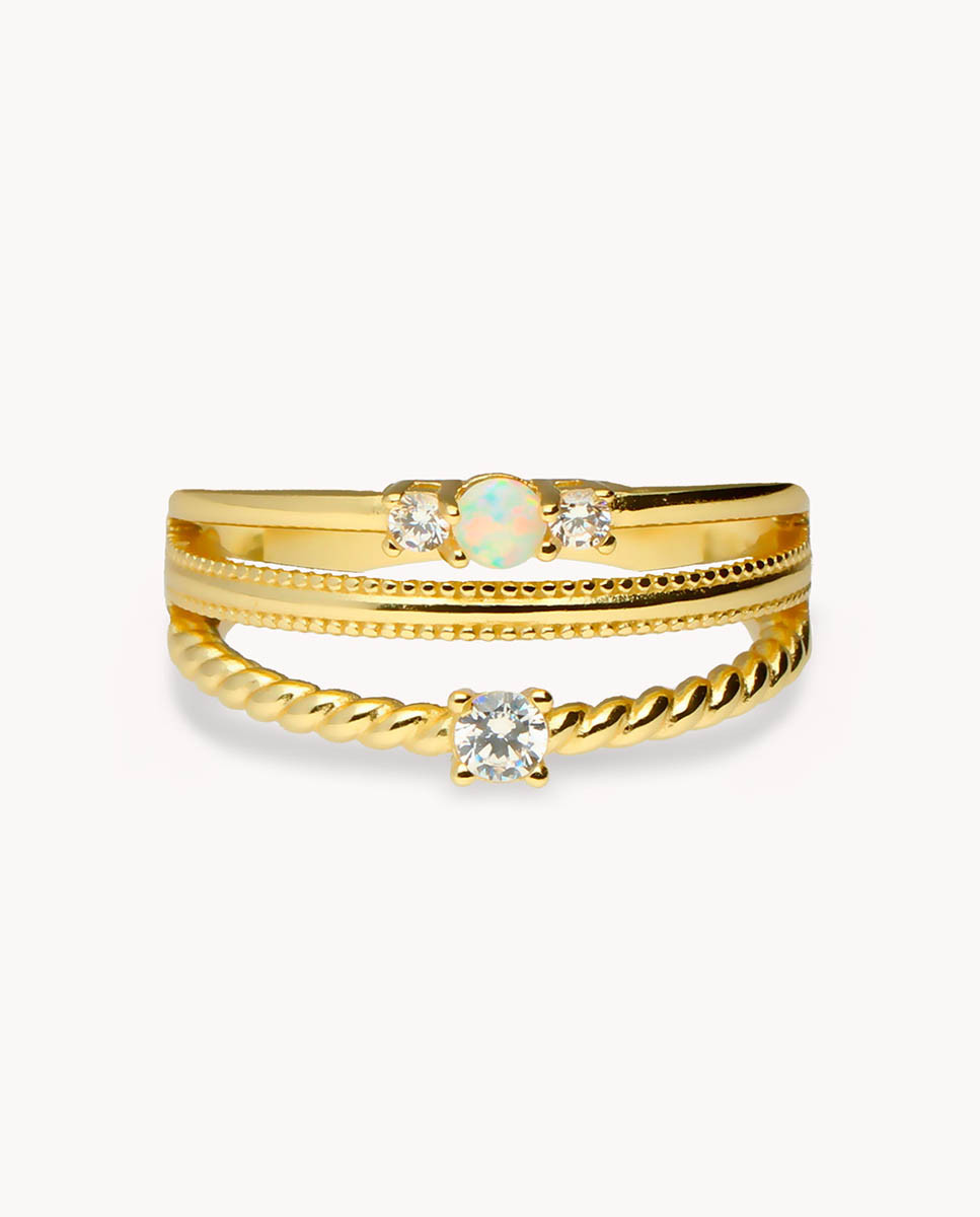 Anillo triple de plata de ley 925 bañada en oro 18K , con solitario de circonita blanca de 3 mm de diámetro, media alianza labrada y solitario con piedra natural Ópalo y circonitas blancas de 2 mm de diámetro en ambos lados.