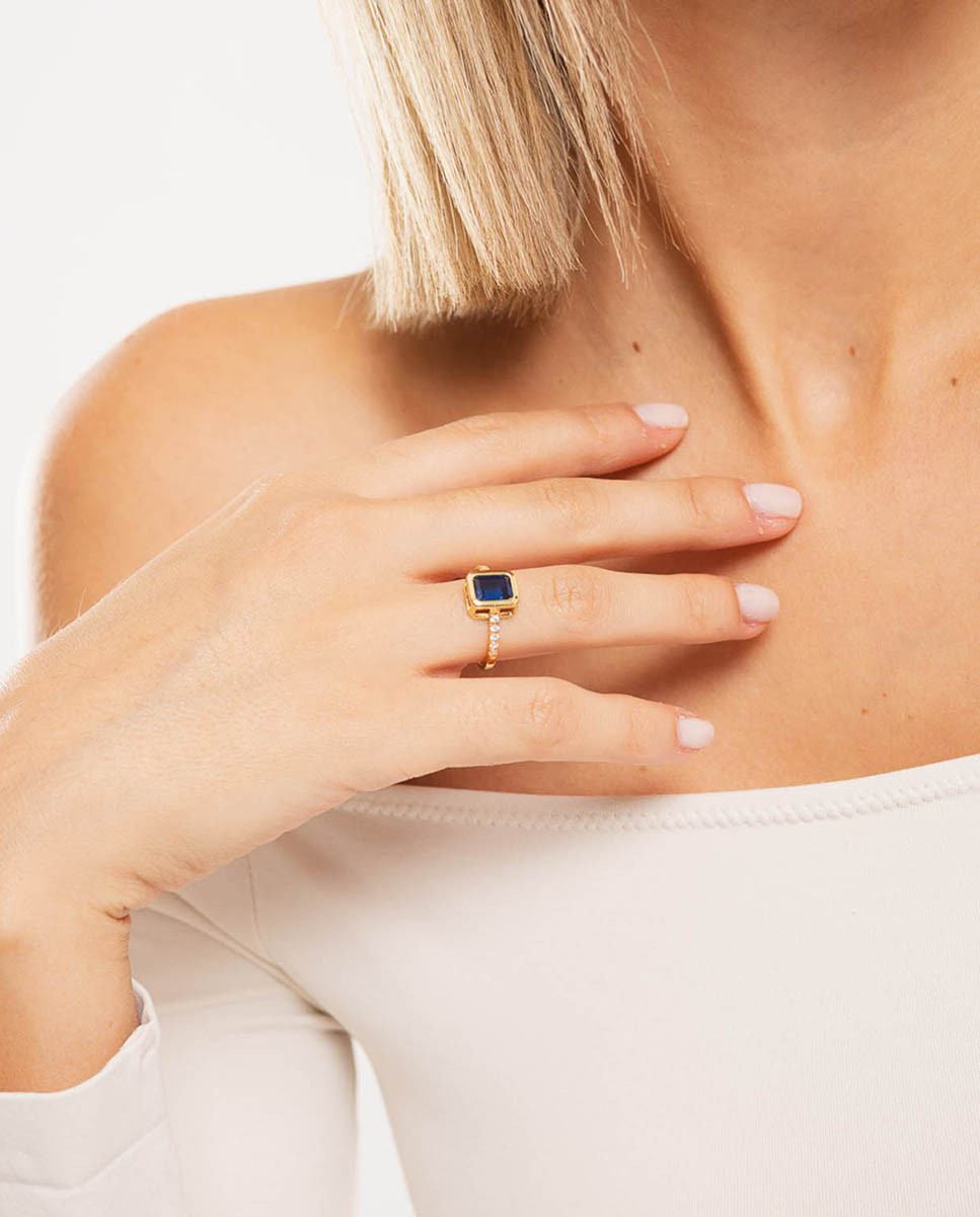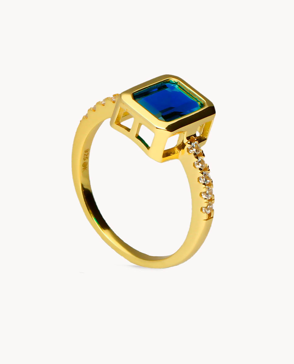 Anillo de plata de ley 925 bañada en oro 18K con circonita central color zafiro de 5 mm x 8 mm (ancho por alto) y carril de circonitas blancas en ambos laterales.