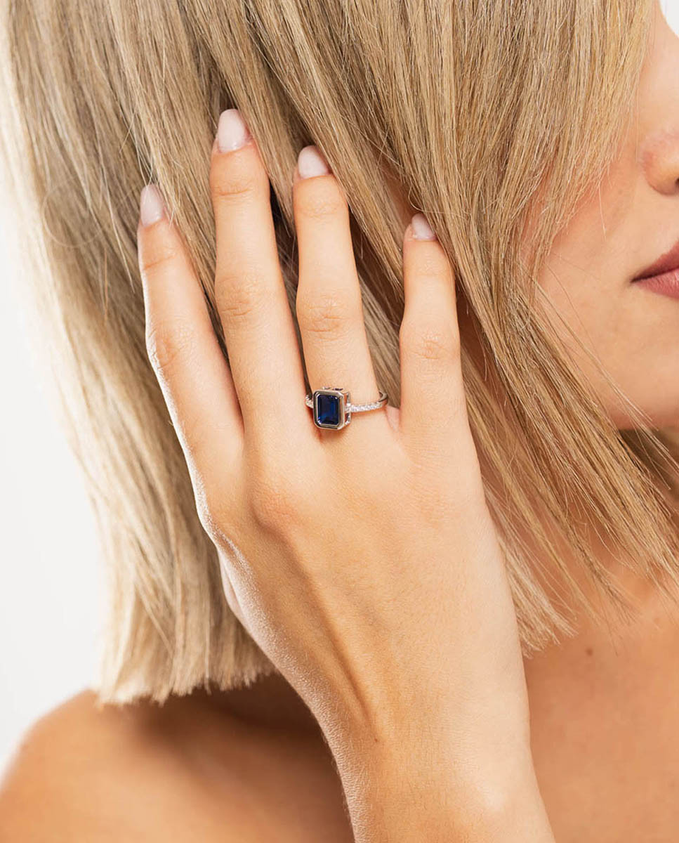Anillo de plata de ley 925 bañada en rodio con circonita central color zafiro de 5 mm x 8 mm (ancho por alto) y carril de circonitas blancas en ambos laterales.