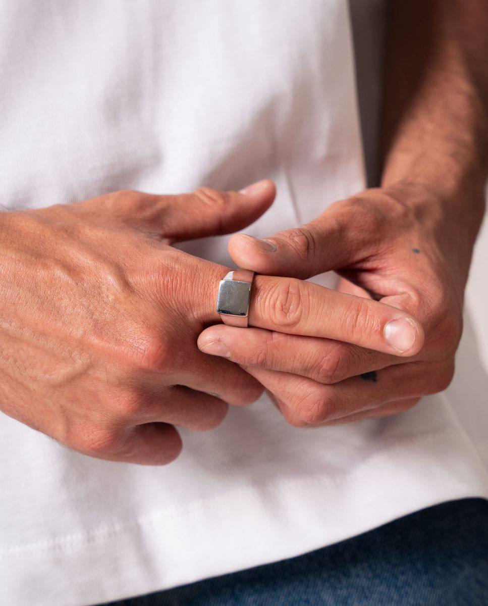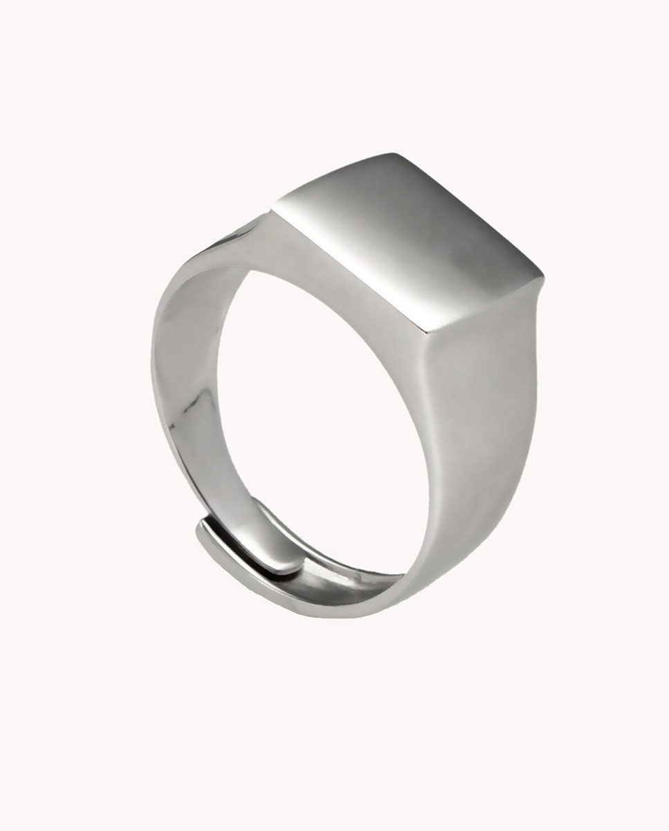 Anillo tipo sello de plata de ley 925 bañada en rodio con parte central de 12 mm x 12 mm (ancho por alto) y medida regulable.