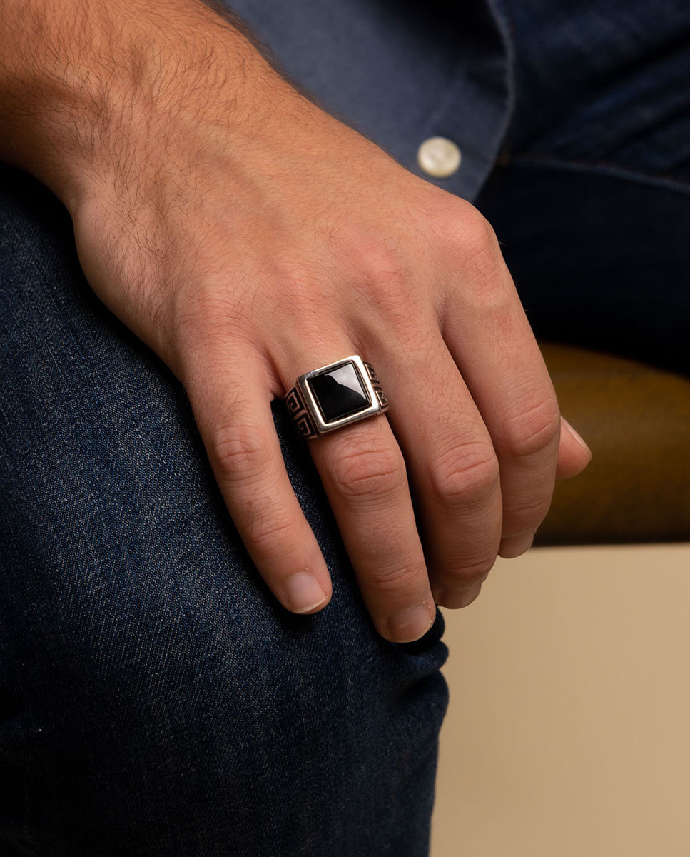 Anillo de acero inoxidable tipo sello con IP negro y piedra de Ónix central.