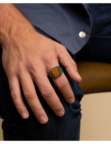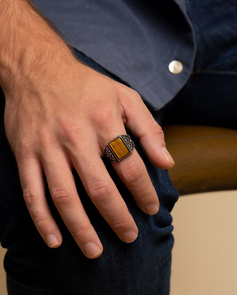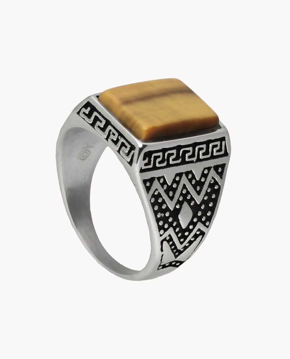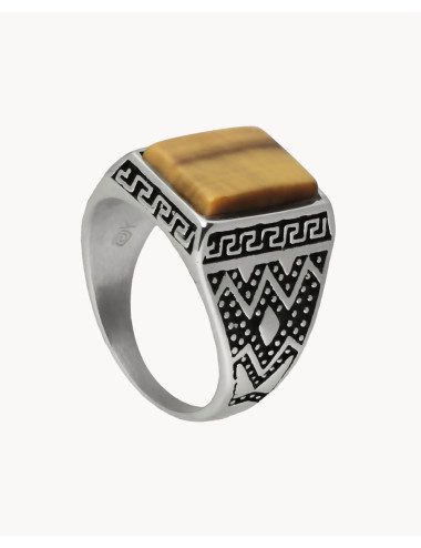 Anillo de acero inoxidable tipo sello con IP negro y piedra de ojo de tigre central.