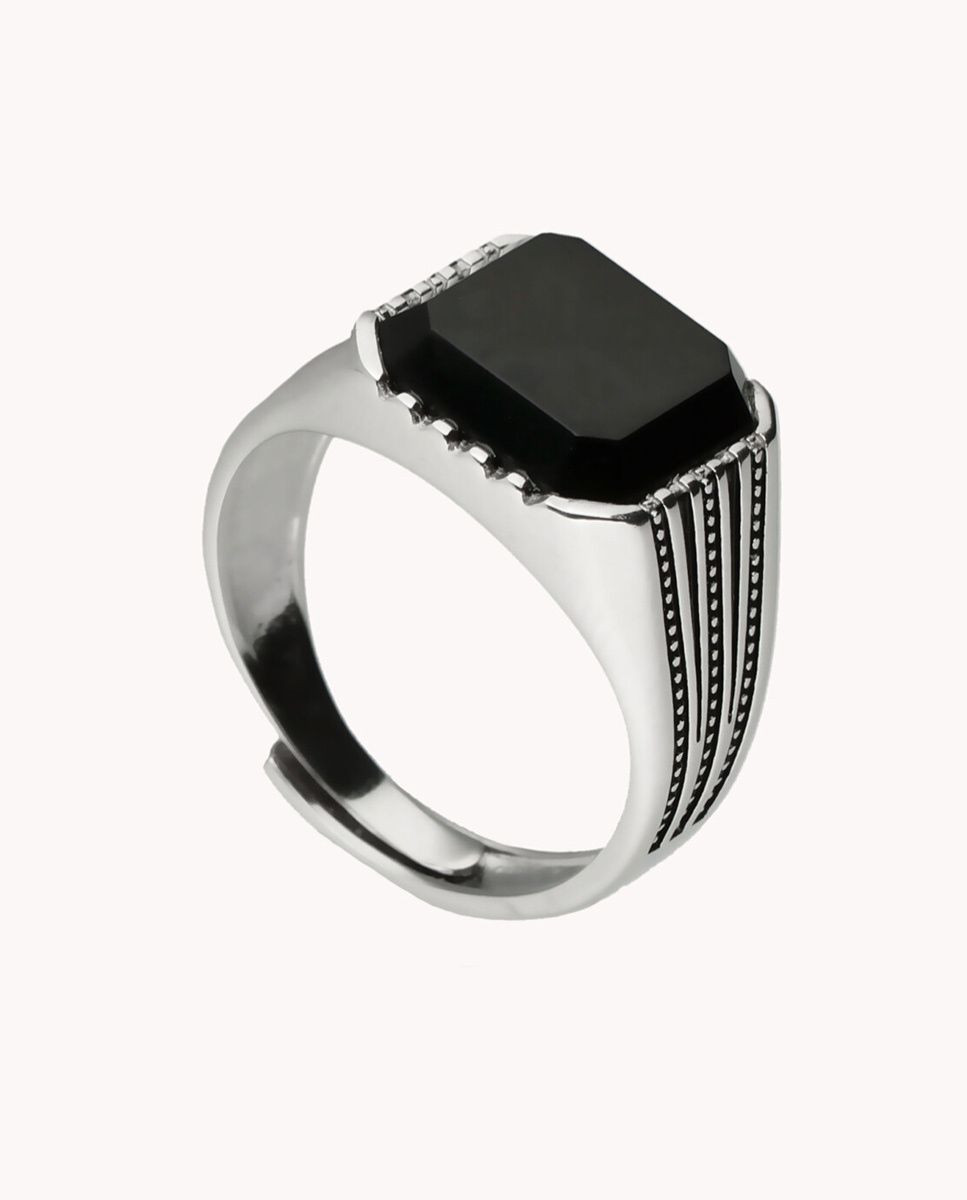 Anillo de plata de ley 925 bañada en rodio tipo sello con piedra cuadrada de Ónix, medida regulable.