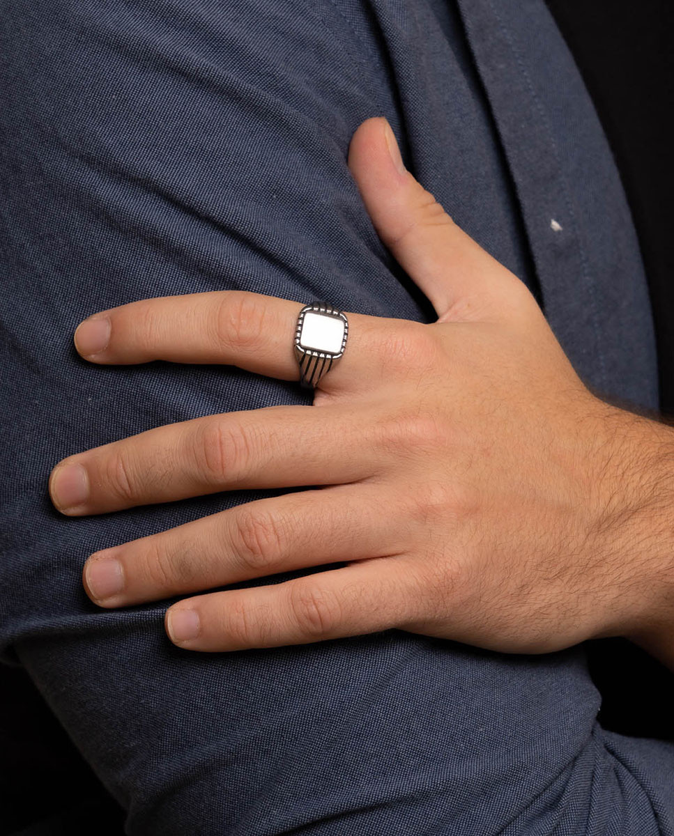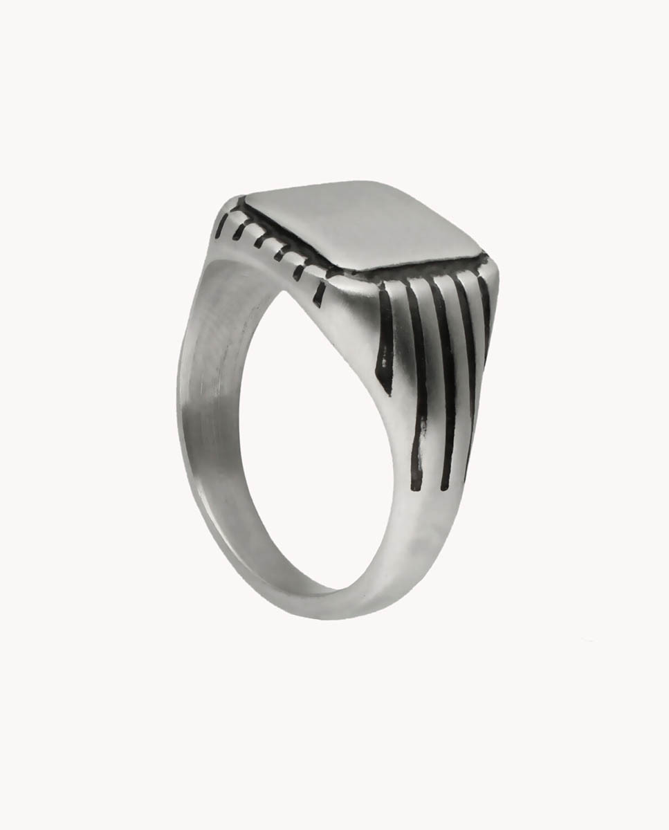 Anillo de acero inoxidable con acabado matizado y detalles en IP negro tipo sello.