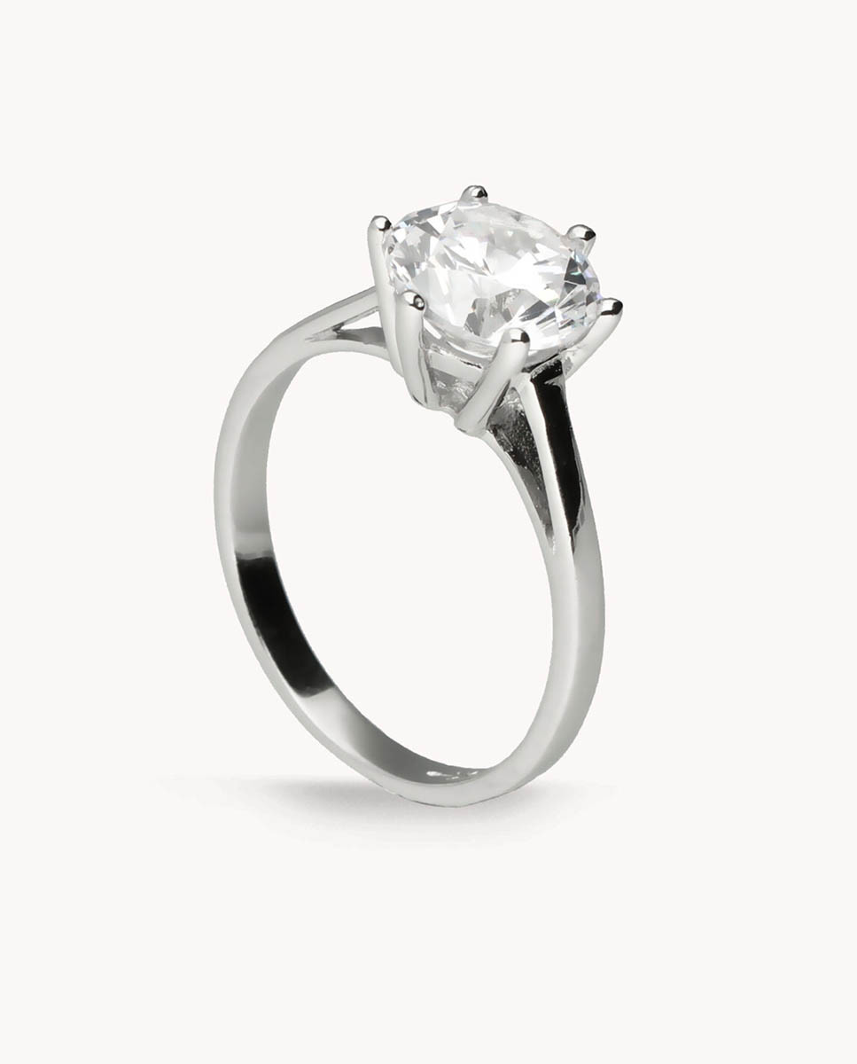 Anillo de plata de ley 925 bañada en rodio, tipo solitario con circonita redonda central blanca de 1 cm engastada en seis garras.