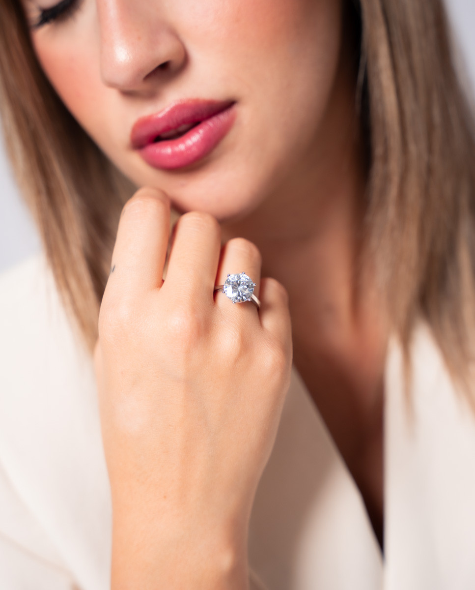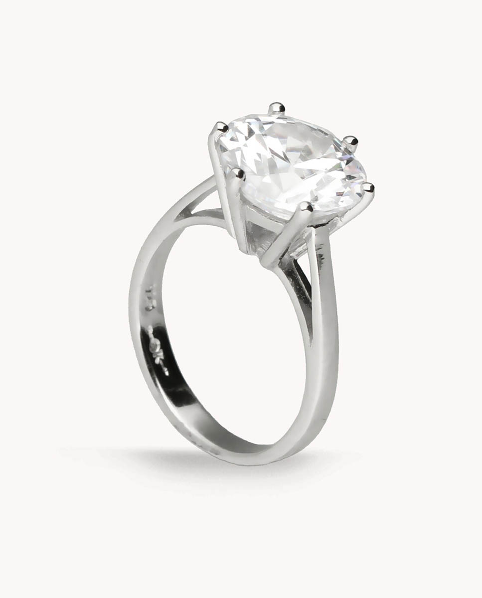 Anillo de plata de ley 925 bañada en rodio, tipo solitario con circonita redonda central blanca de 1 cm engastada en seis garras.