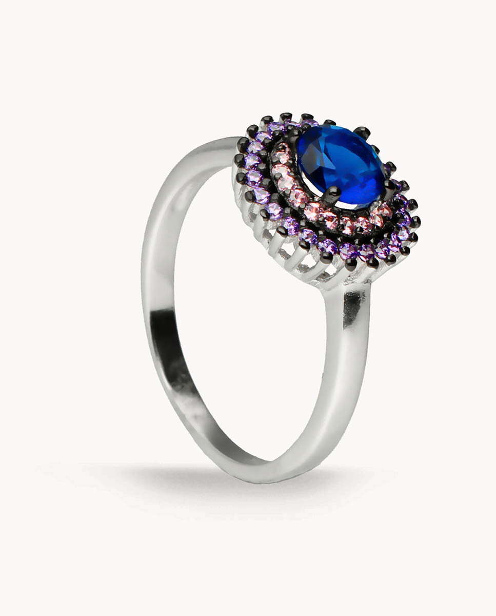 Anillo sortija zafiro círculo y amatistas de plata de ley 925 bañada en rodio