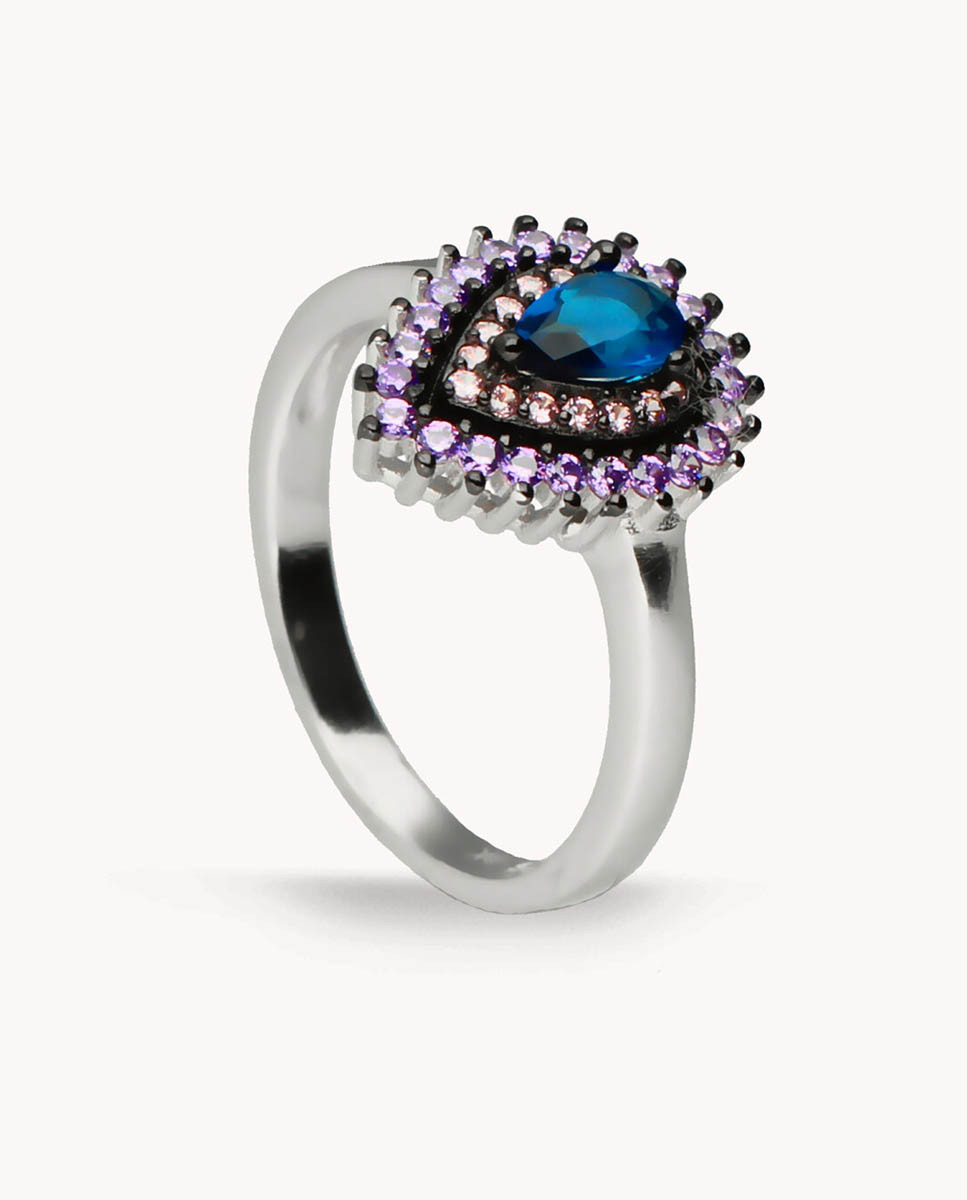 Anillo de plata de ley 925 bañada en rodio, con circonita lágrima central zafiro de 4 mm engastada en tres garras y rodeando su contorno múltiples circonitas amatistas.