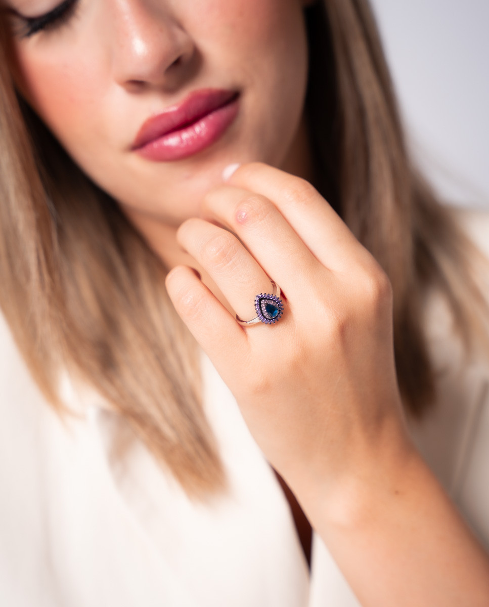 Anillo sortija zafiro lágrima en amatista de plata de ley 925 bañada en rodio