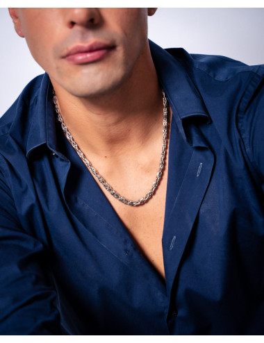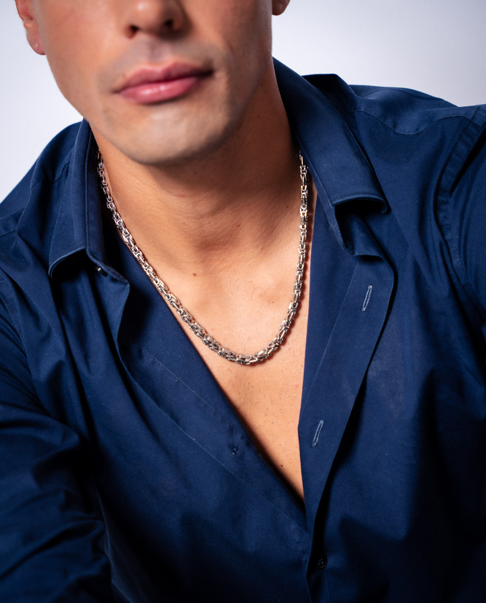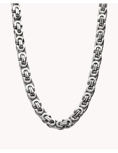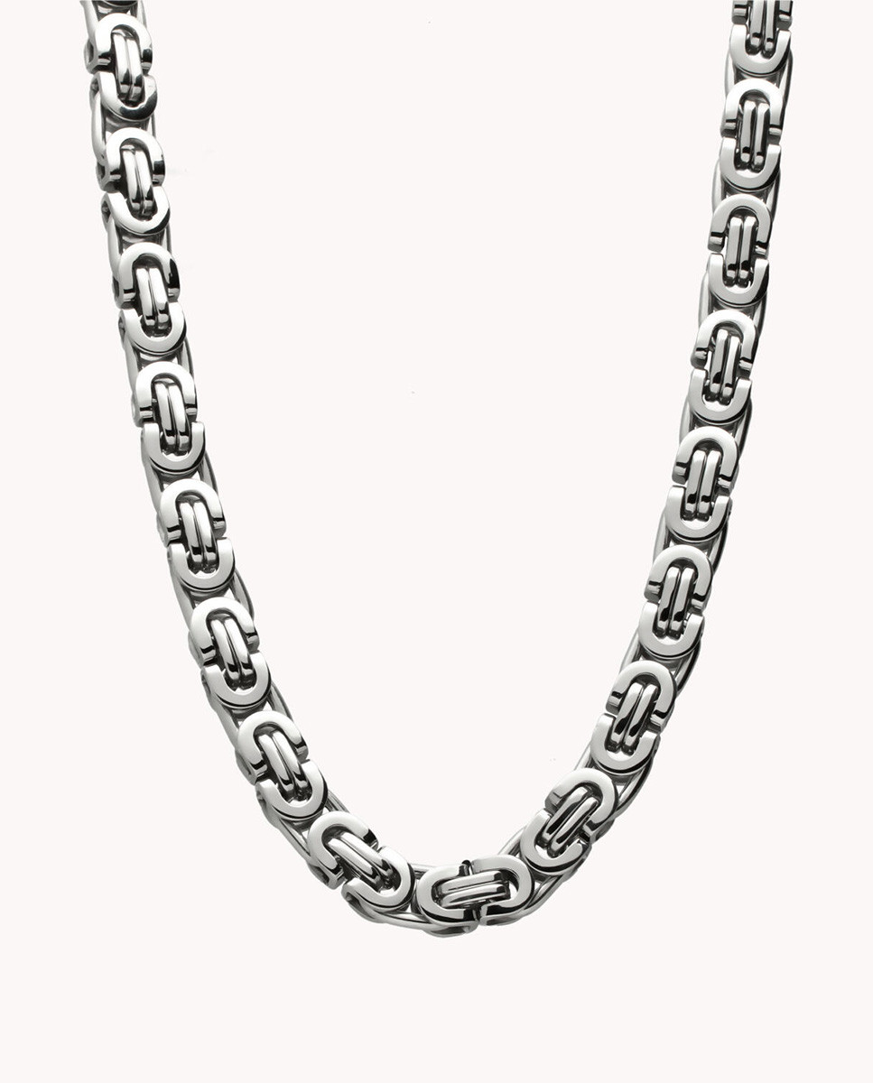 Cadena de acero inoxidable con eslabón tipo bizantino de 6 mm de ancho, cierre de mosquetón y largo de 50 cms más 4 cms de alargador.