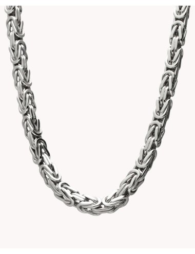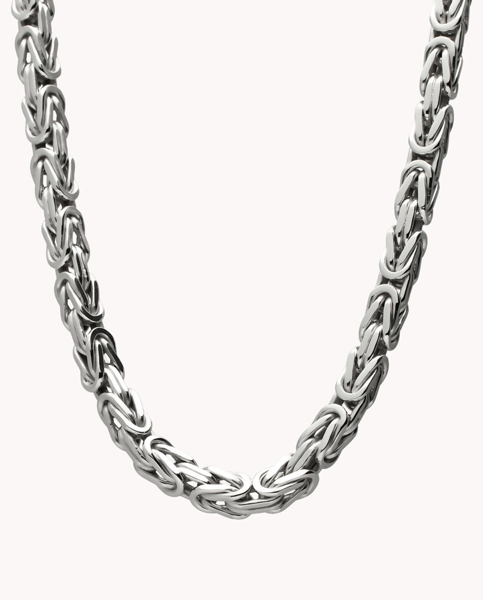Cadena de plata de ley 925 bañada en rodio con eslabón tipo bizantino de 5 mm de ancho y 60 cms de largo, cierre de mosquetón.