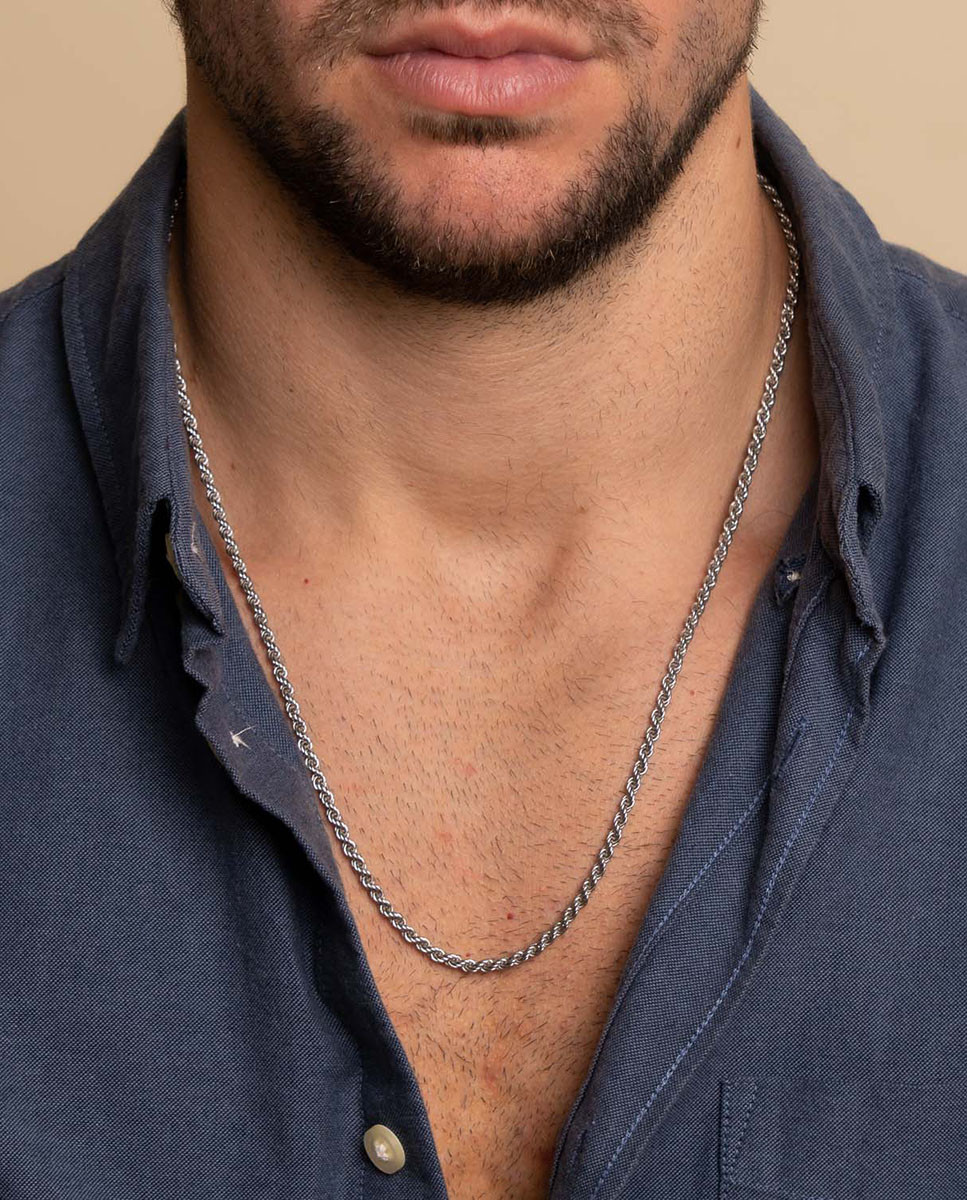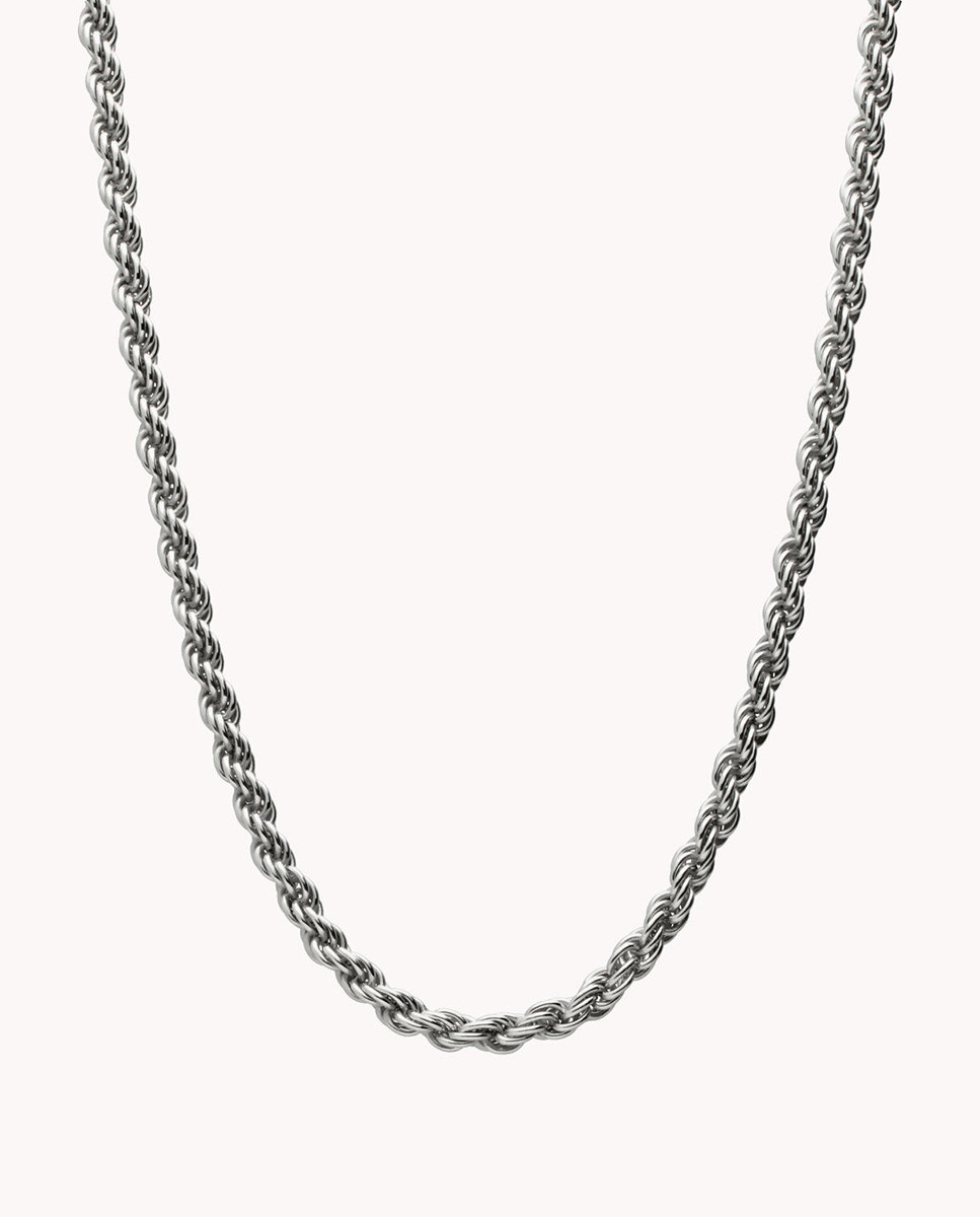 Cadena de plata de ley 925 bañada en rodio con eslabón tipo cordón macizo de 3 mm de ancho y 60 cms de largo, cierre de mosquetón.