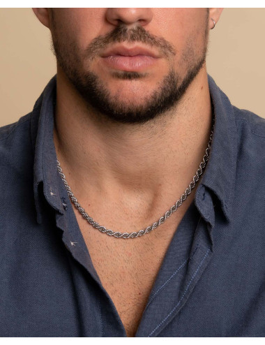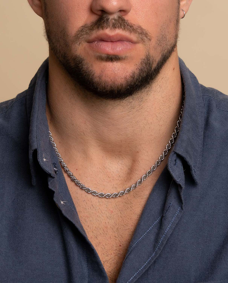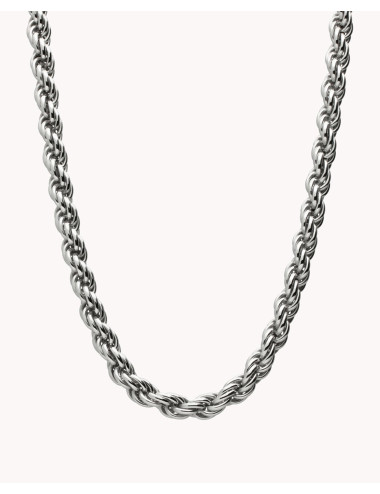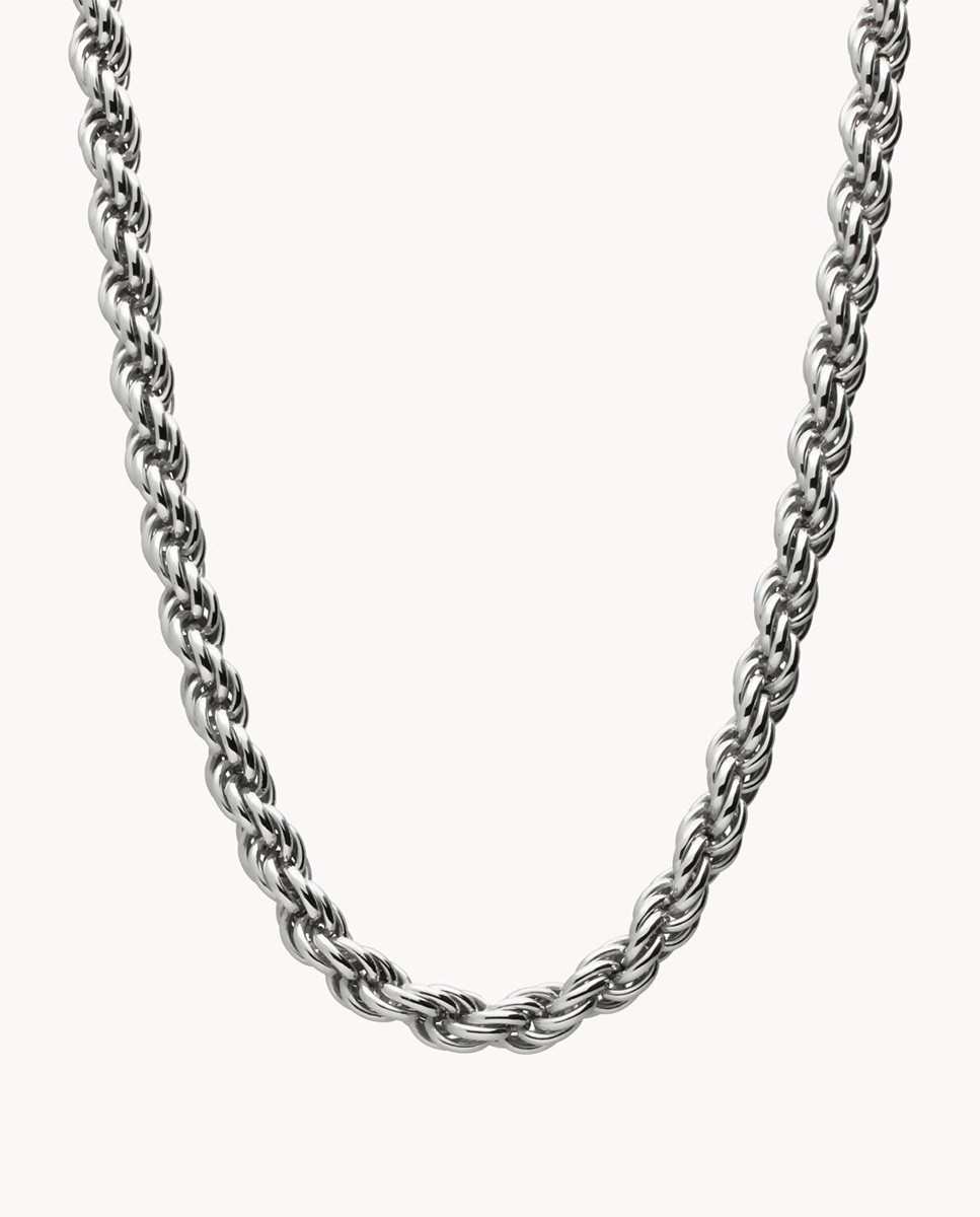 Cadena de plata de ley 925 bañada en rodio con eslabón tipo cordón macizo de 5 mm de ancho y 50 cms de largo, cierre de mosquetón.
