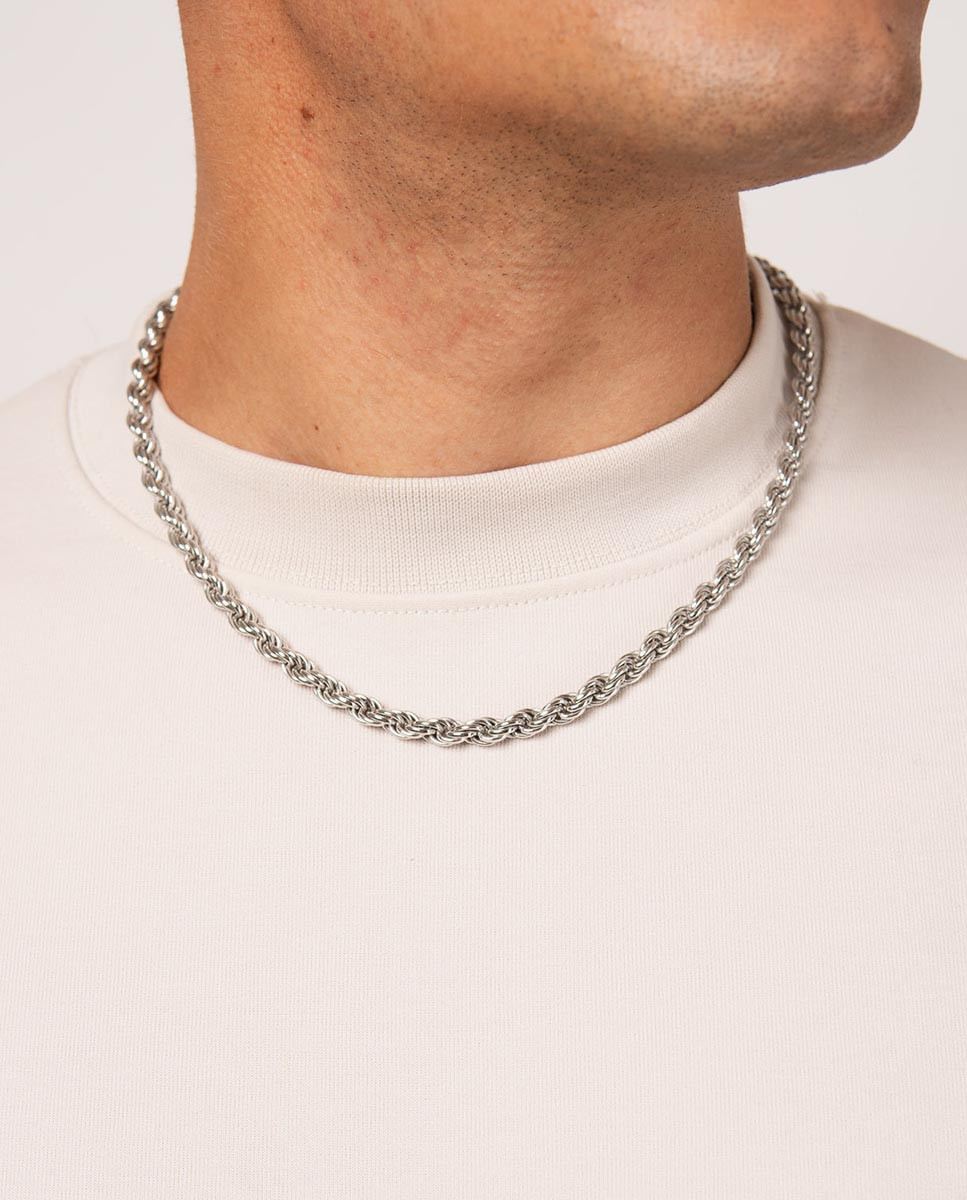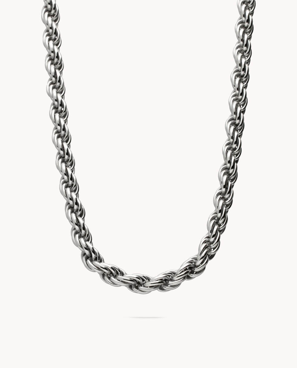 Cadena de plata de ley 925 bañada en rodio con eslabón tipo cordón macizo de 6 mm de ancho y 50 cms de largo, cierre de mosquetón.
