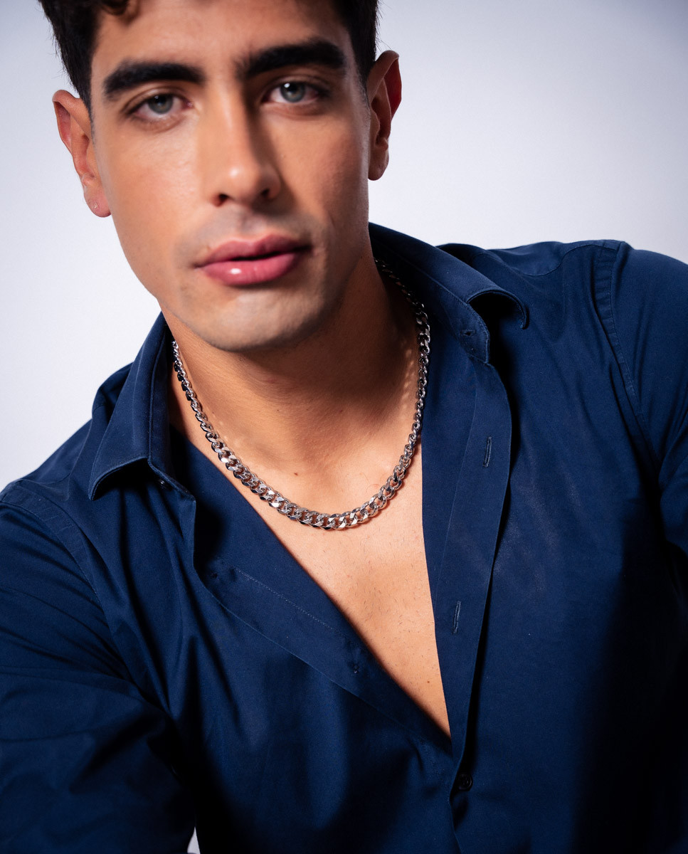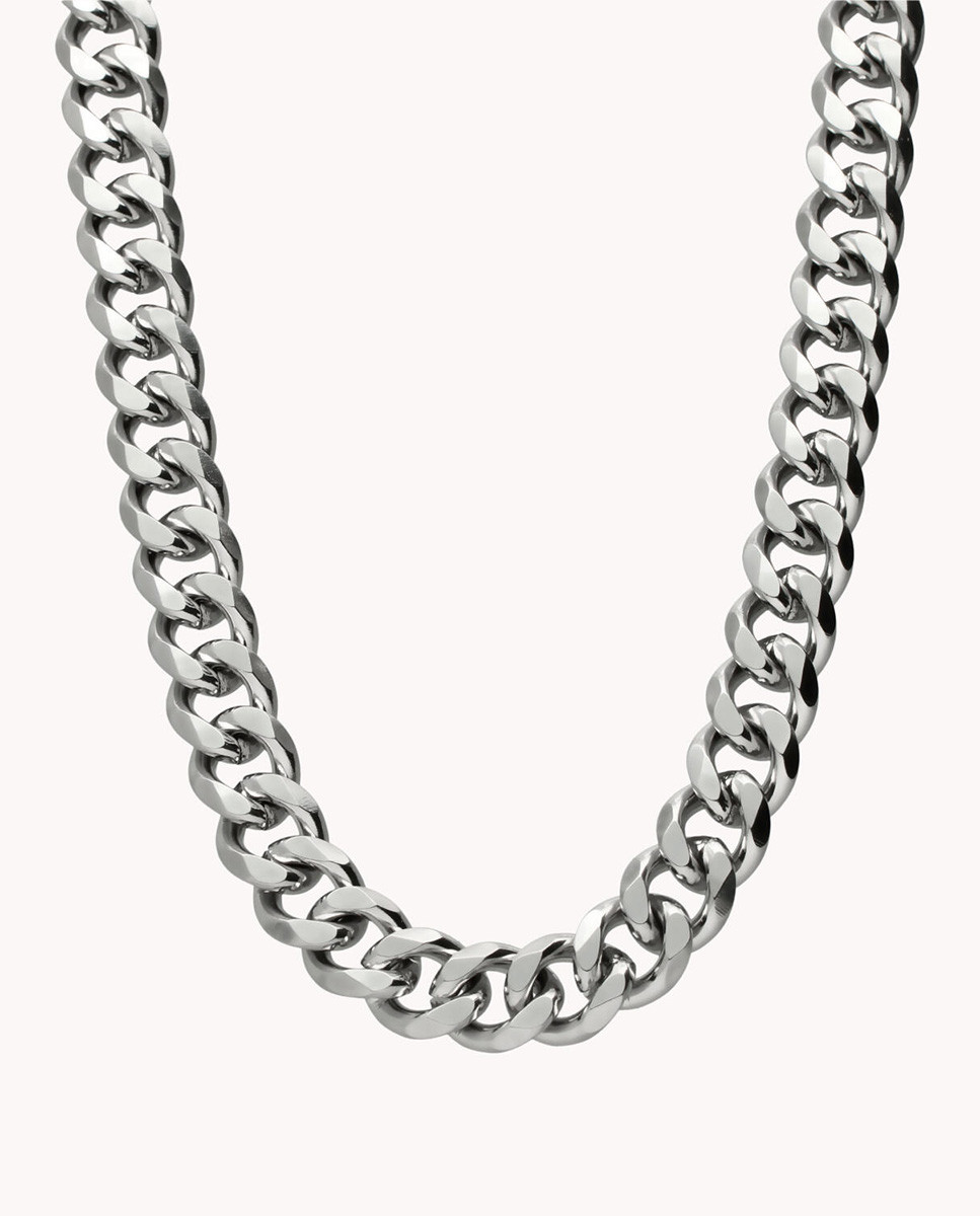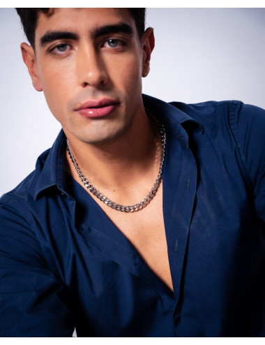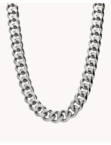 Cadena de acero inoxidable con eslabón tipo barbado de 9 mm de ancho y 2,5 mm de grosor, largo de 50 cms y cierre de mosquetón.