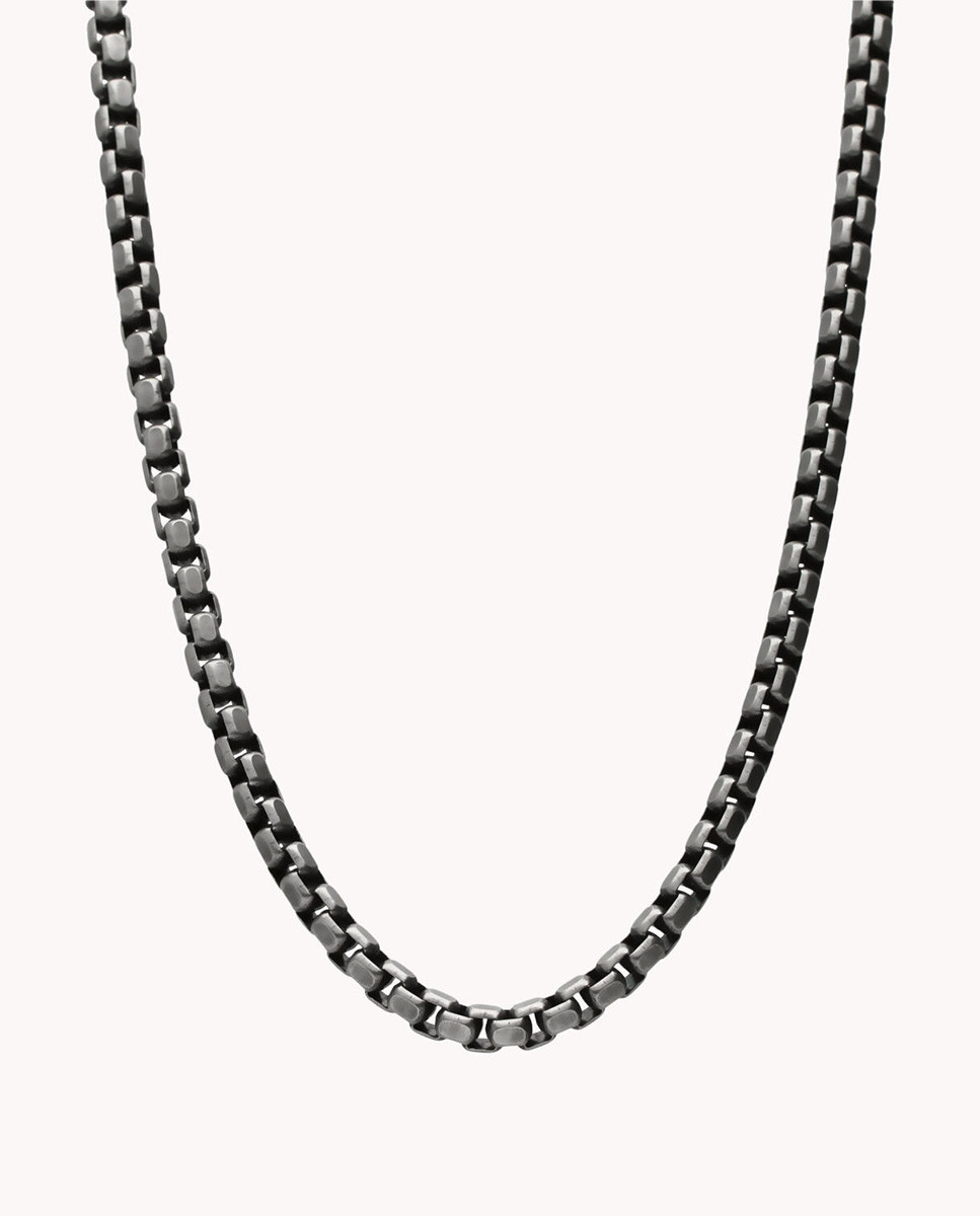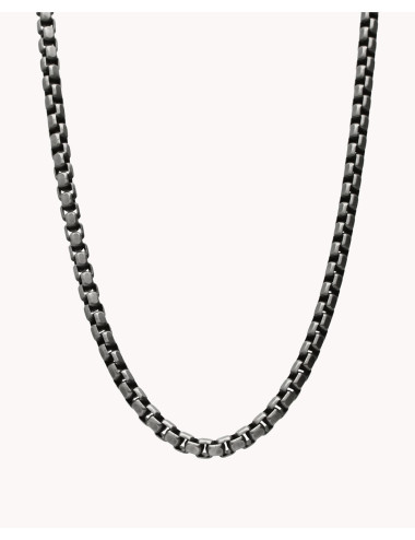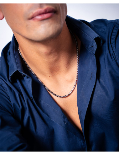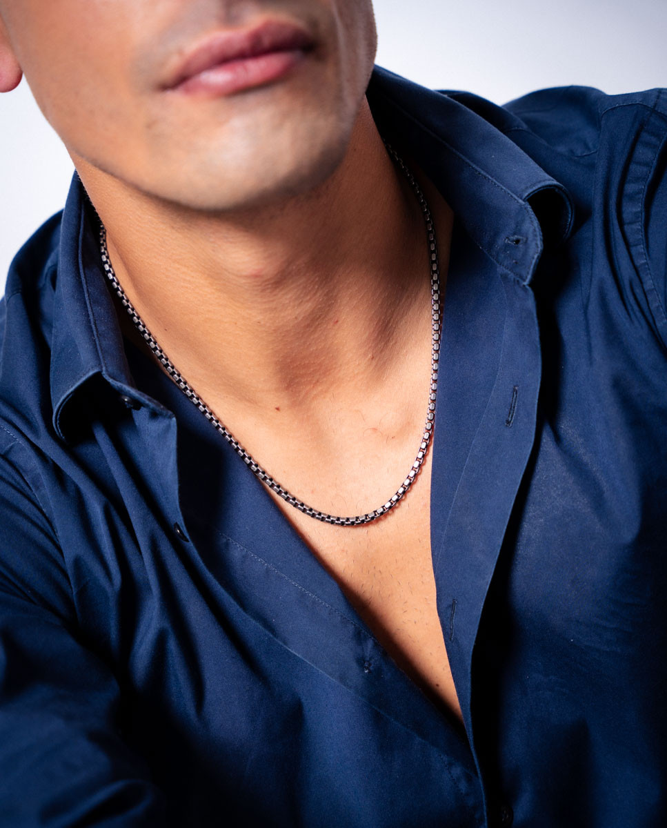 Cadena de acero inoxidable bañada en rutenio de 50 cms de largo y 4 cms de alargador con cierre de mosquetón.