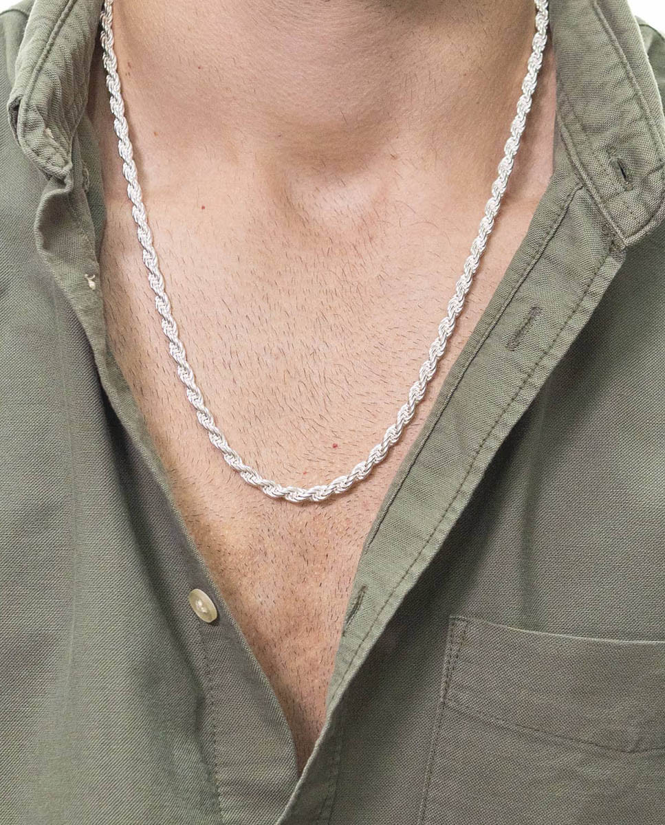 Cadena de plata de ley 925 con eslabón tipo cordón macizo de 5 mm de ancho y 60 cms de largo, cierre de mosquetón.