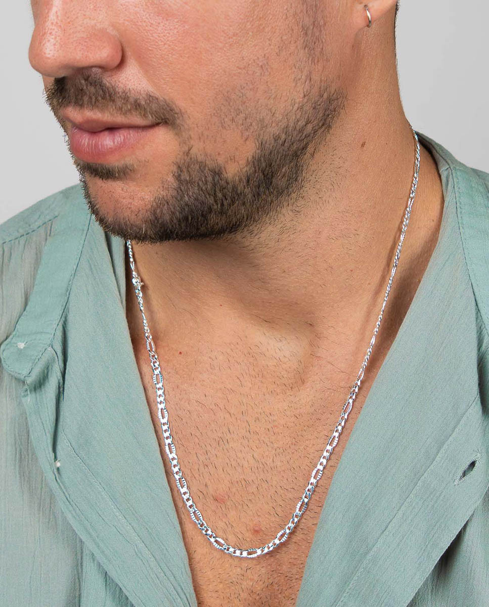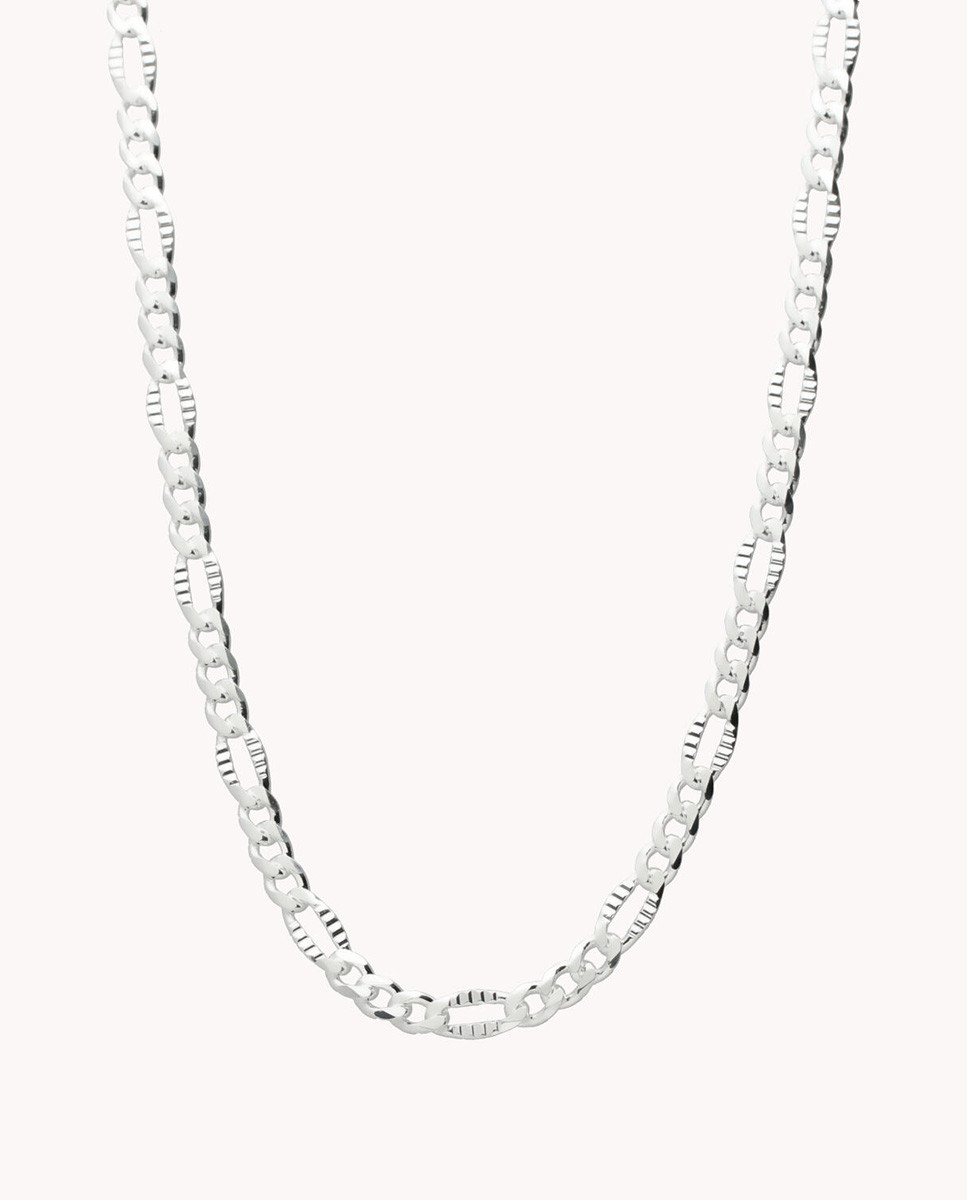 Cadena de plata de ley 925 con eslabón tipo cartier lapidado de 4,15 mm de ancho y 60 cms de largo, cierre de mosquetón.