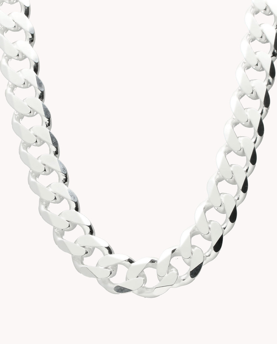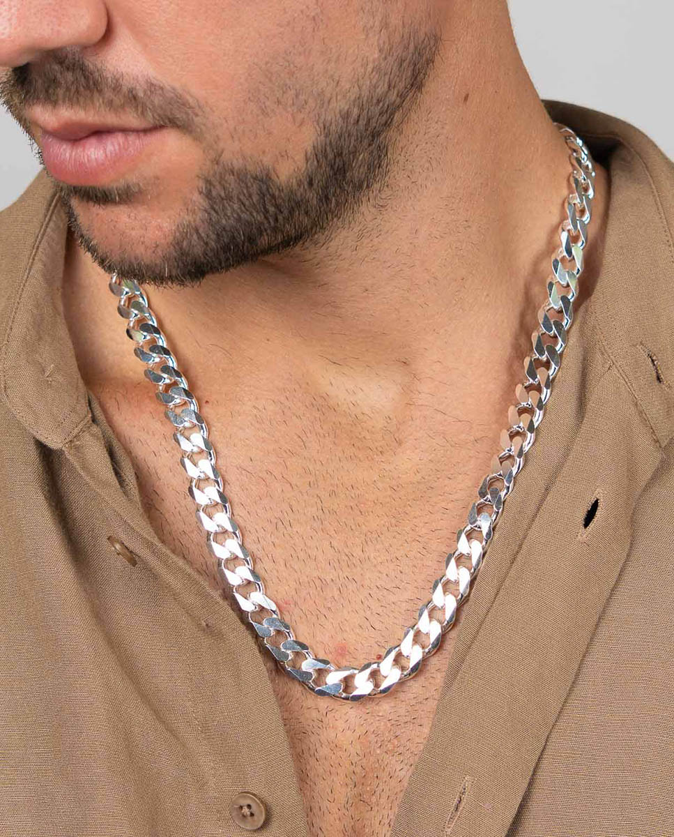 Cadena de plata de ley 925 con eslabón tipo barbado de 11,4 mm de ancho, cierre de mosquetón y 60 cms de largo.