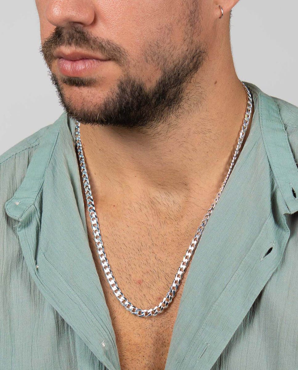 Cadena de plata de ley 925 con eslabón tipo barbado de 6,5 mm de grosor y 60 cms de largo, cierre de mosquetón.