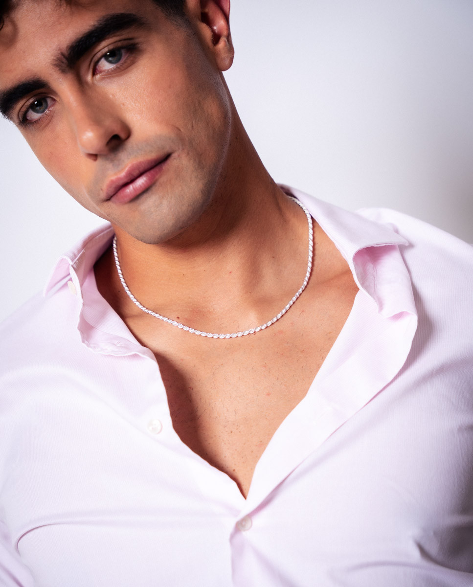 Cadena de plata de ley 925 con eslabón tipo cordón macizo de 3 mm de ancho y 50 cms de largo, cierre de mosquetón.