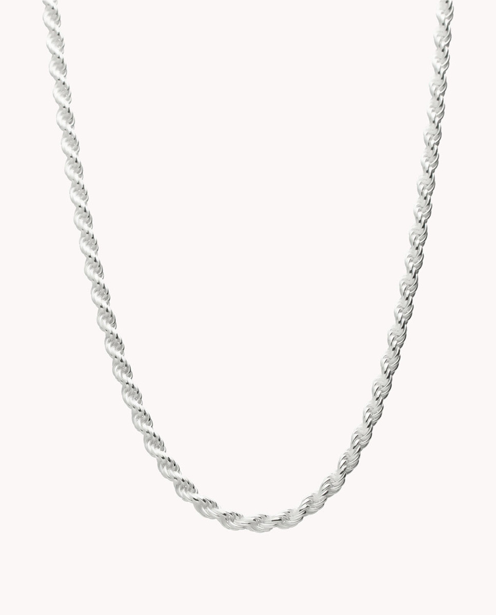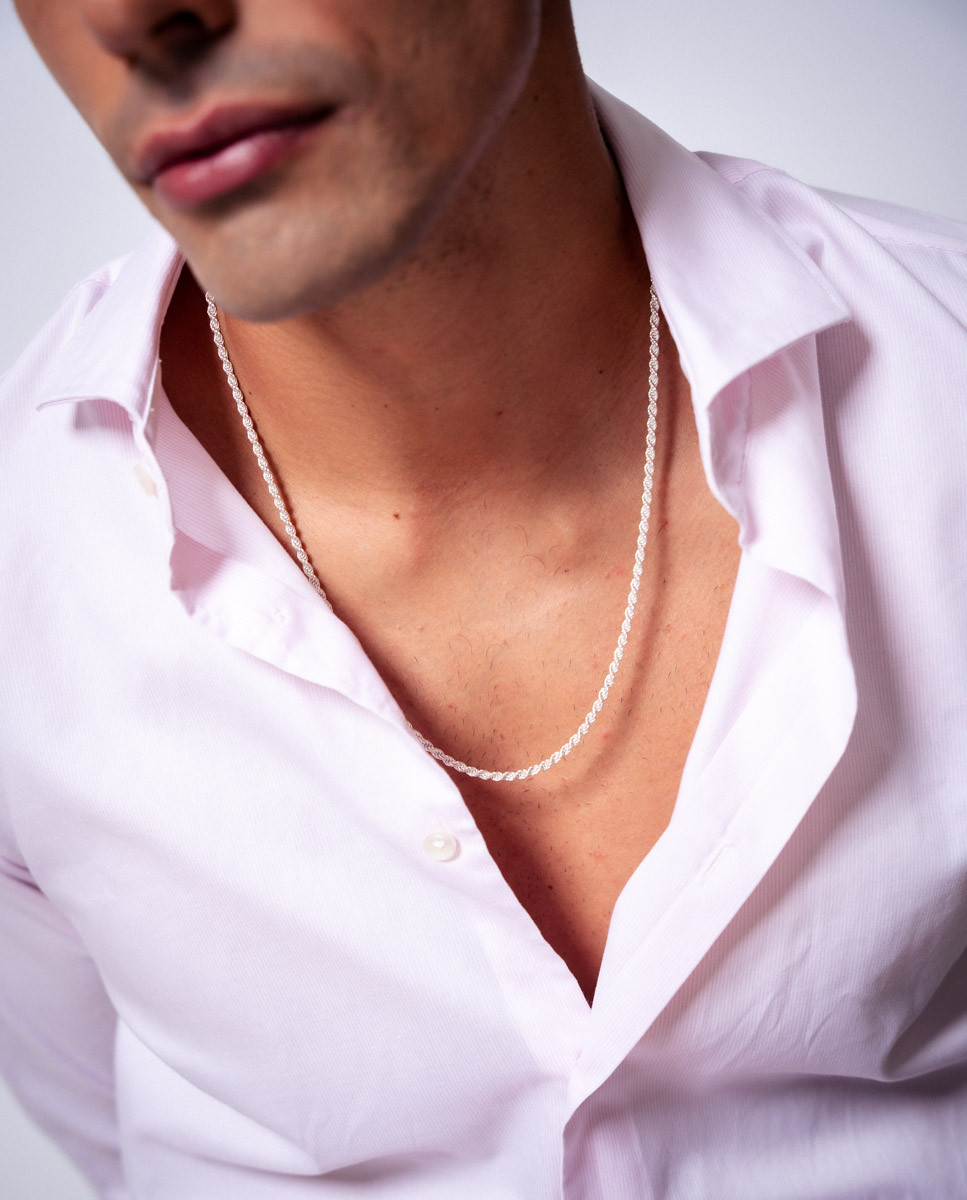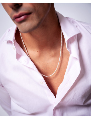 Cadena de plata de ley 925 con eslabón tipo cordón macizo de 3 mm de ancho y 60 cms de largo, cierre de mosquetón.