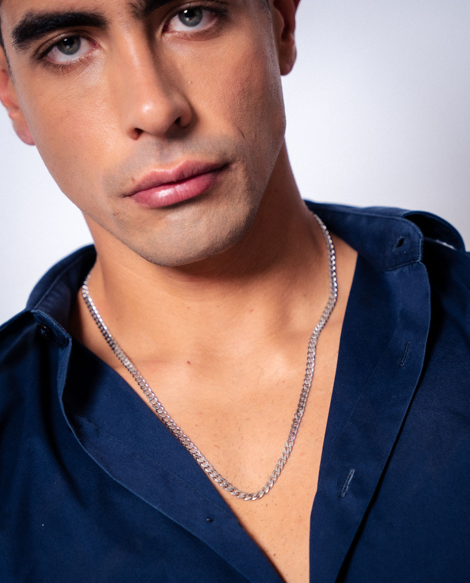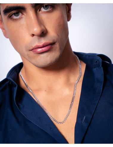 Cadena de plata de ley 925 bañada en rodio con eslabón tipo barbado de 4,7 mm de ancho y 60 cms de largo, cierre de mosquetón.