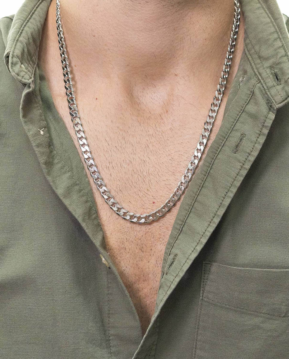Cadena de plata de ley 925 bañada en rodio con eslabón tipo barbado de 7,5 mm de ancho y 60 cms de largo, cierre de mosquetón.