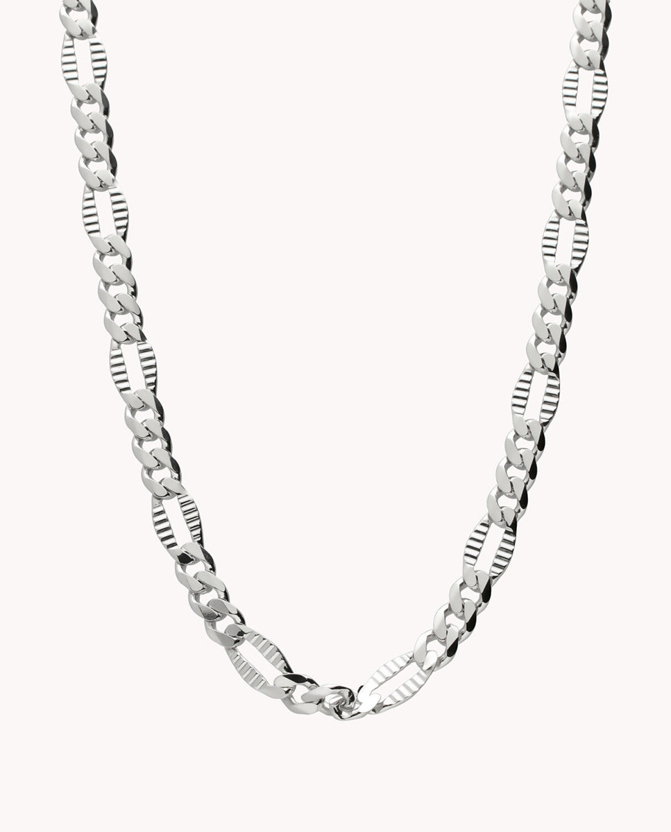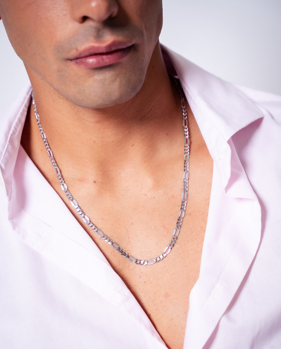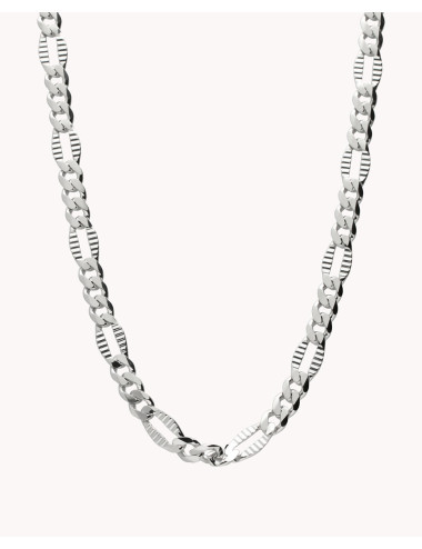 Cadena de plata de ley 925 bañada en rodio con eslabón tipo cartier lapidado de 5,2 mm de ancho y 60 cms de largo, cierre de mosquetón.