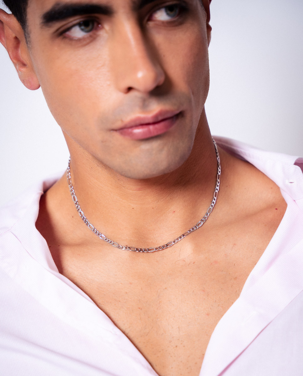 Cadena de plata de ley 925 bañada en rodio con eslabón tipo cartier lapidado de 4,15 mm de ancho y 45 cms de largo, cierre de mosquetón.