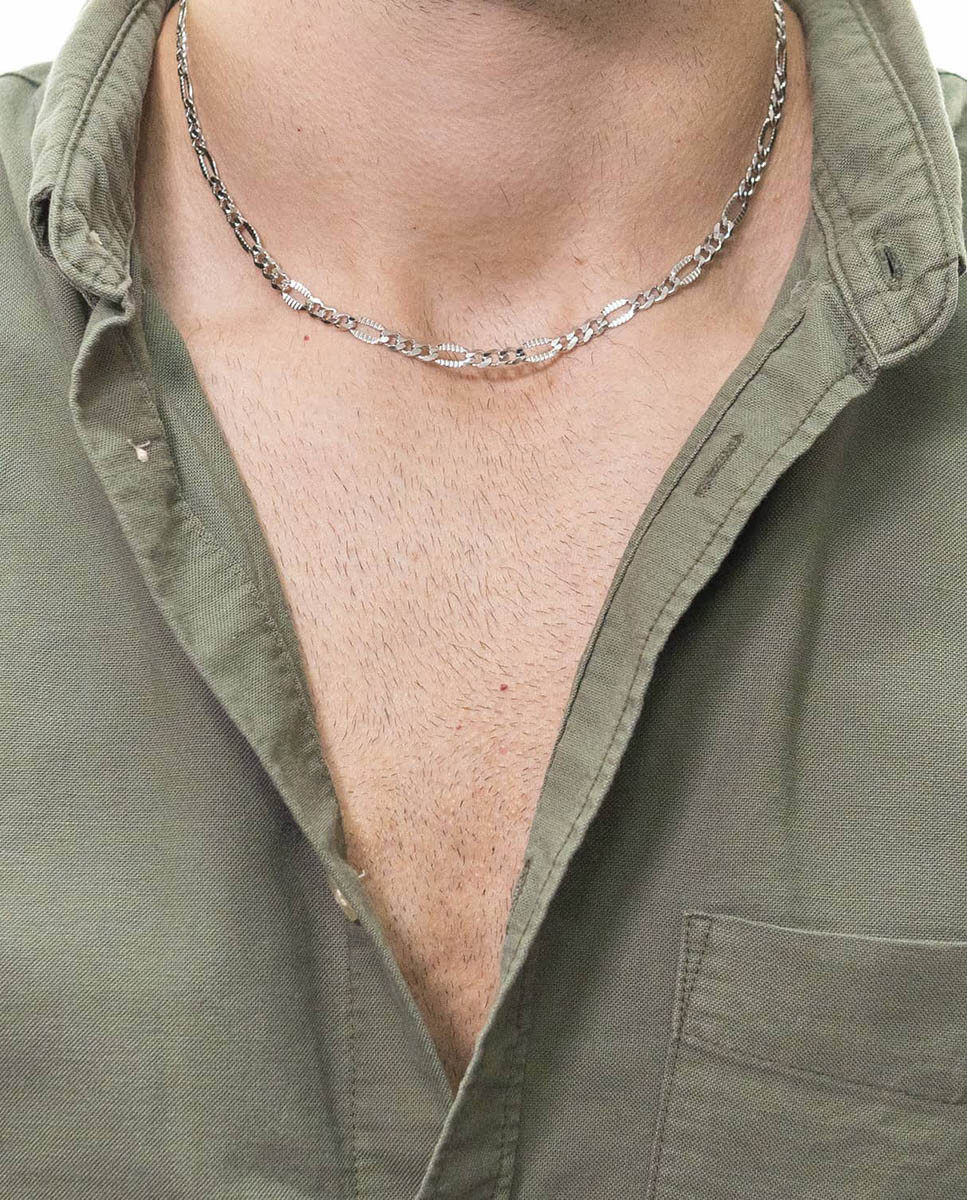Cadena de plata de ley 925 bañada en rodio con eslabón tipo cartier lapidado de 5,2 mm de ancho y 45 cms de largo, cierre de mosquetón.