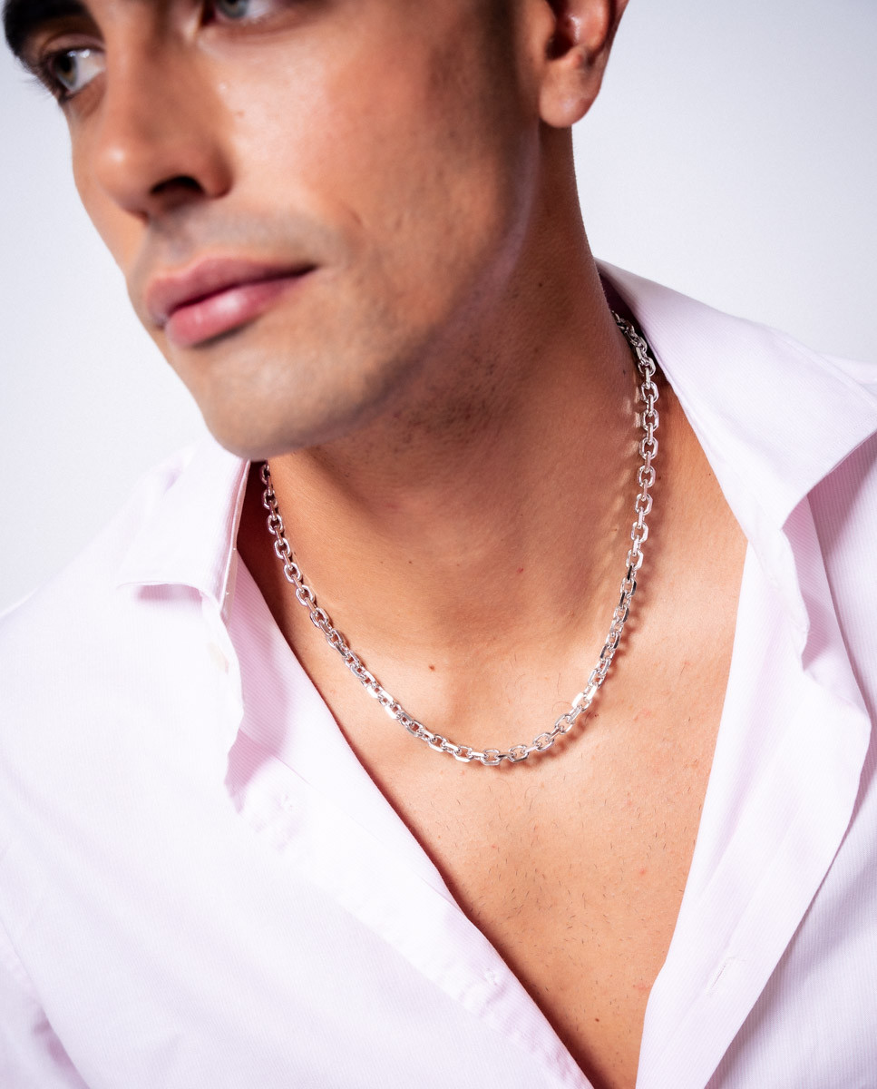 Cadena de plata de ley 925 bañada en rodio con eslabones de 5 mm de ancho y 50 cms de largo, cierre de mosquetón.