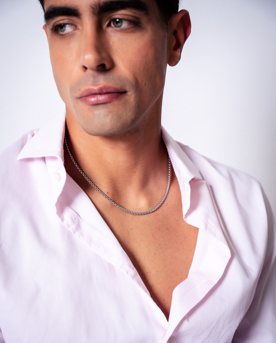 Cadena de plata de ley 925 bañada en rodio con eslabón tipo veneciano de 3 mm de ancho y 50 cms de largo, cierre de mosquetón.