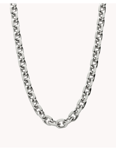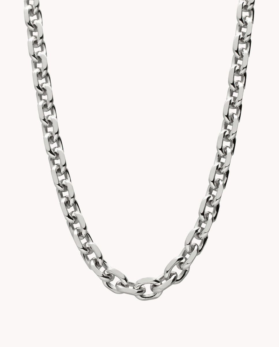 Cadena de plata de ley 925 bañada en rodio con eslabones de 5 mm de ancho y 60 cms de largo, cierre de mosquetón.