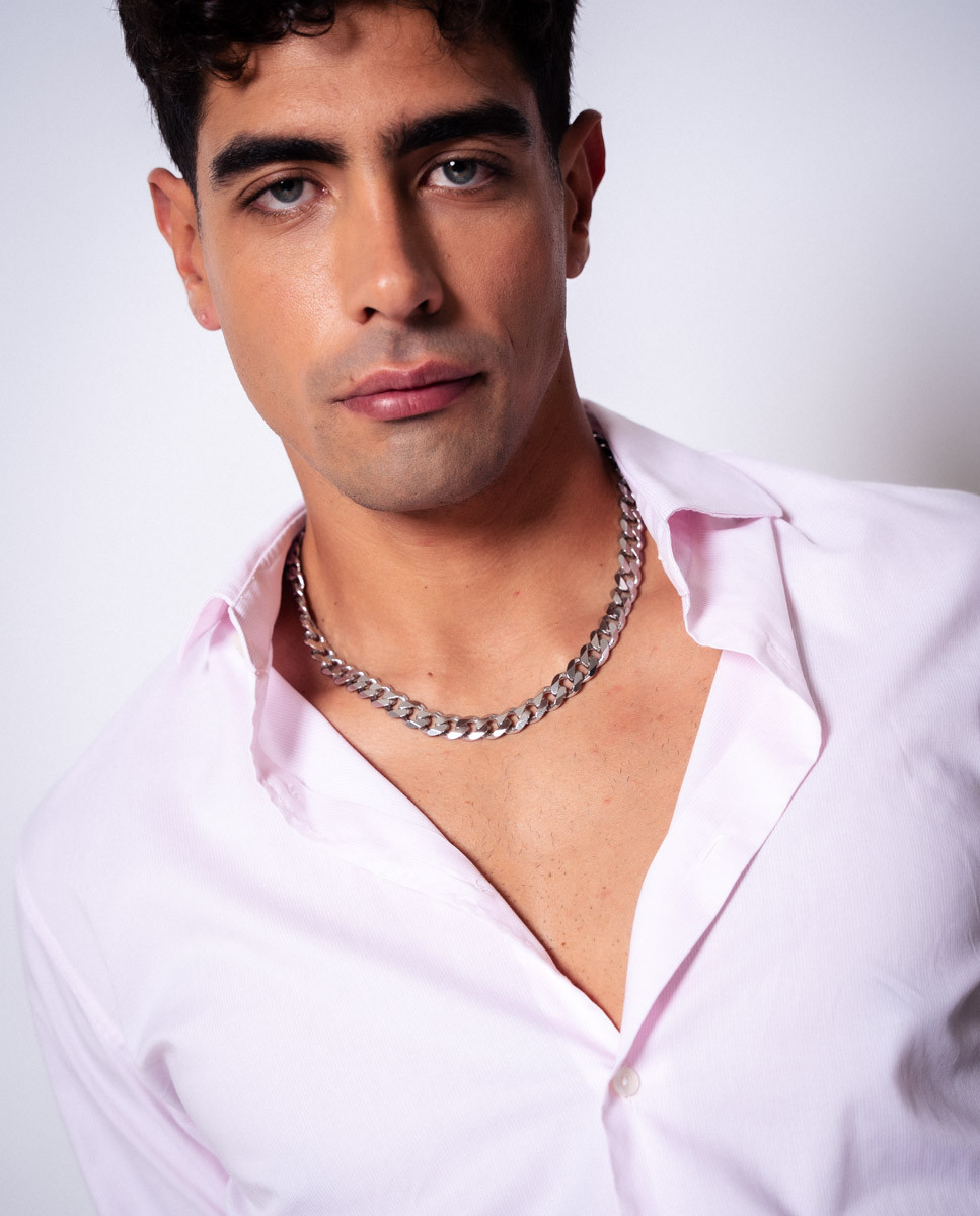 Cadena de plata de ley 925 bañada en rodio con eslabón tipo barbado de 11,4 mm de ancho y 50 cms de largo, cierre de mosquetón.