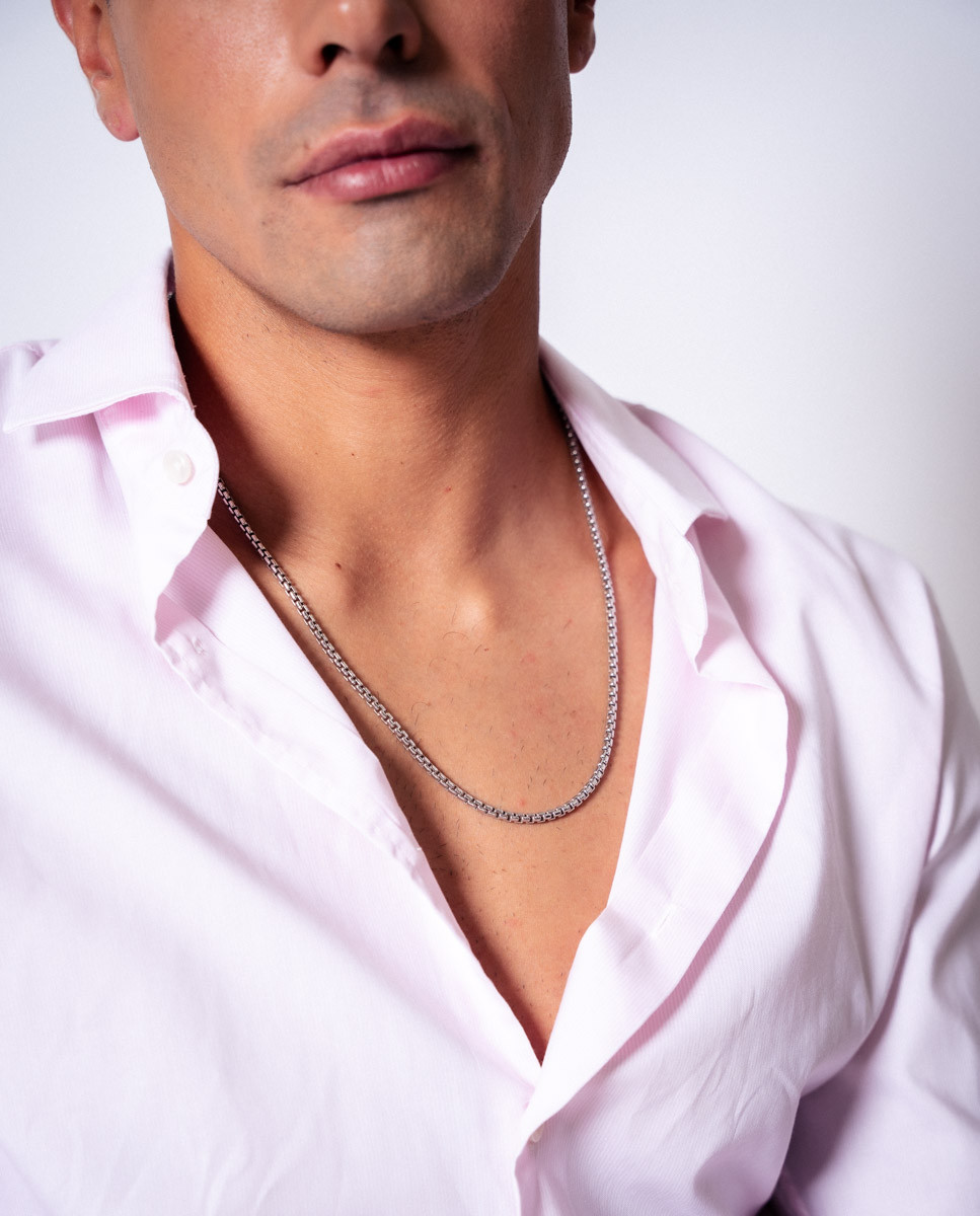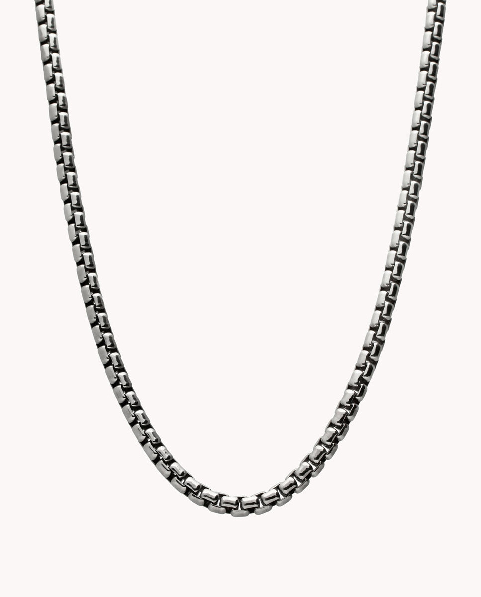 Cadena de plata de ley 925 bañada en rodio con eslabón tipo veneciano de 3 mm de ancho y 60 cms de largo, cierre de mosquetón.