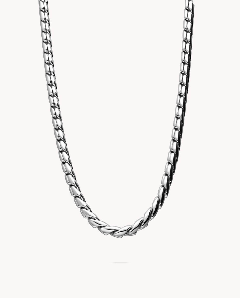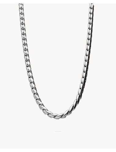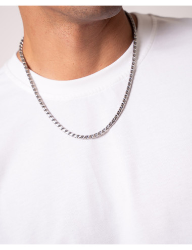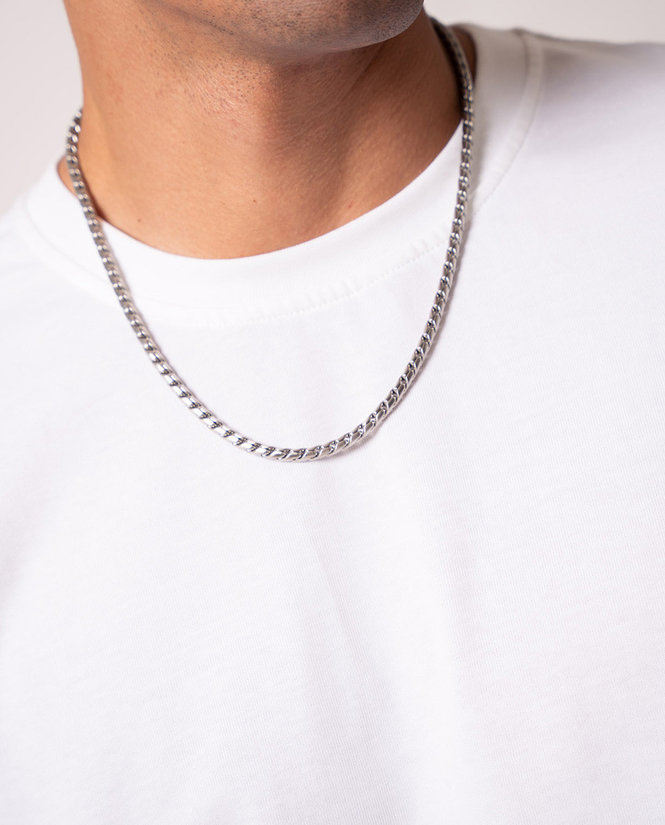 Cadena de acero inoxidable matizado, largo de 50 cms más 5 cms de alargador y cierre de mosquetón.
