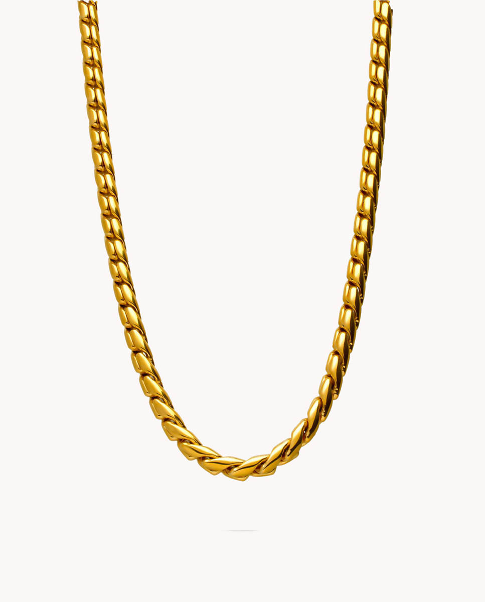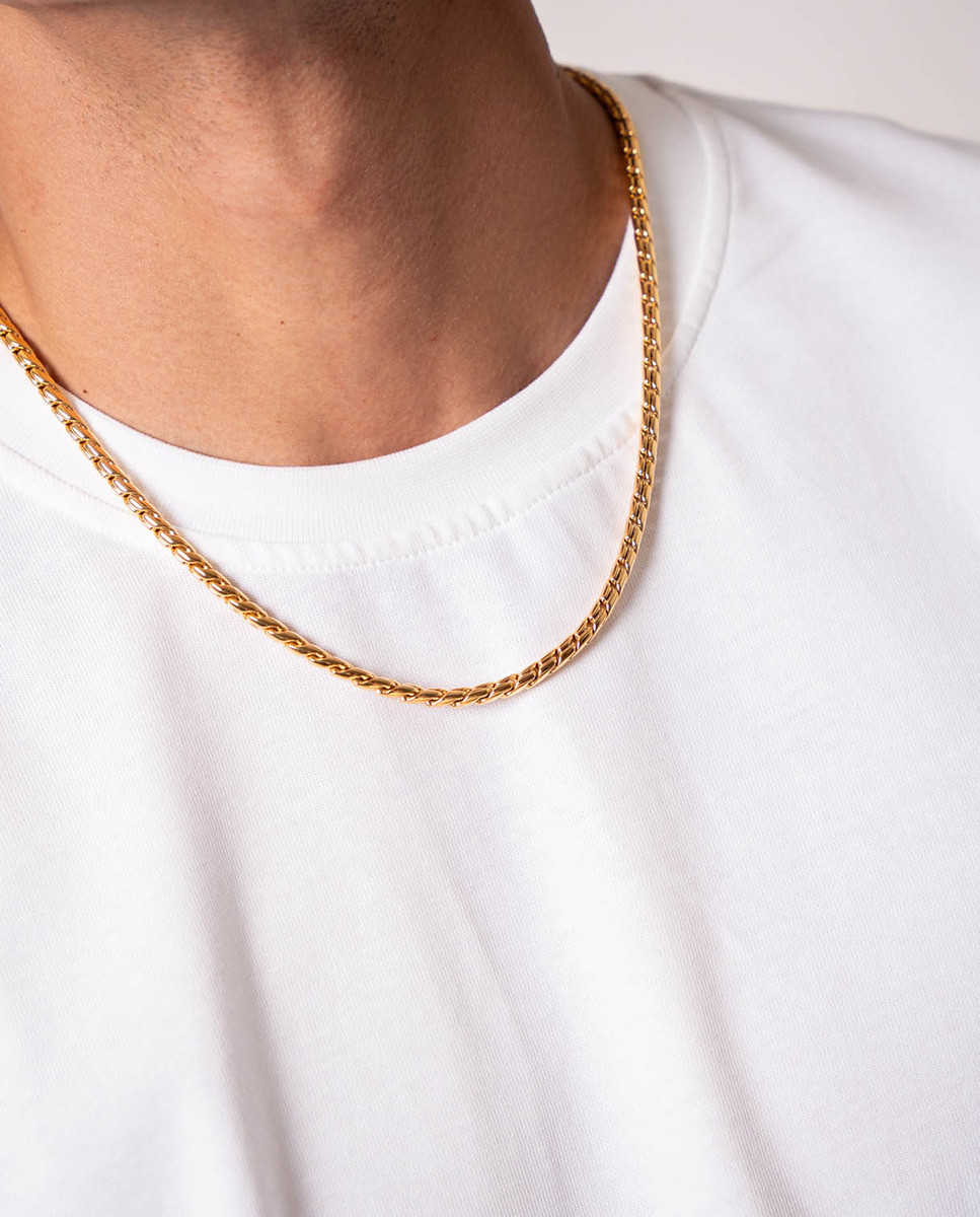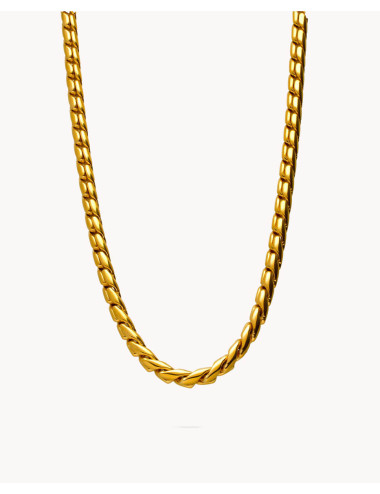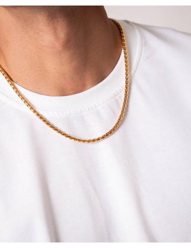 Cadena de acero inoxidable bañado en oro 18K, largo de 50 cms más 5 cms de alargador y cierre de mosquetón.