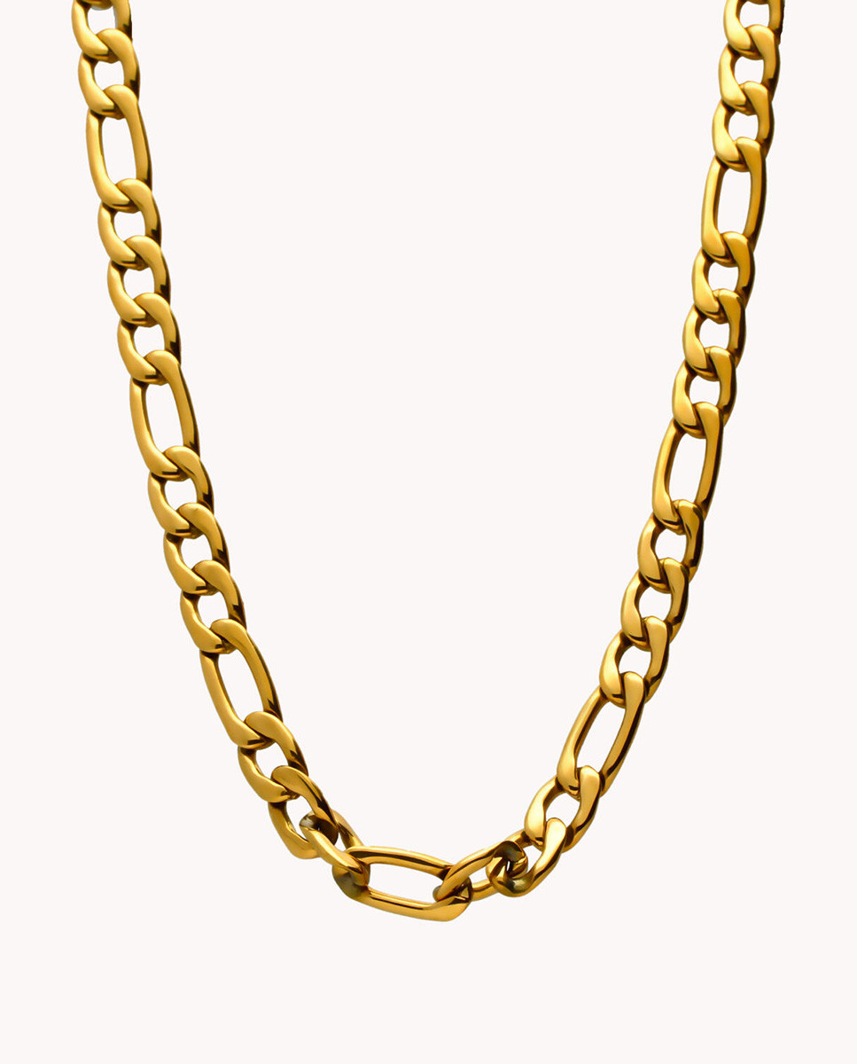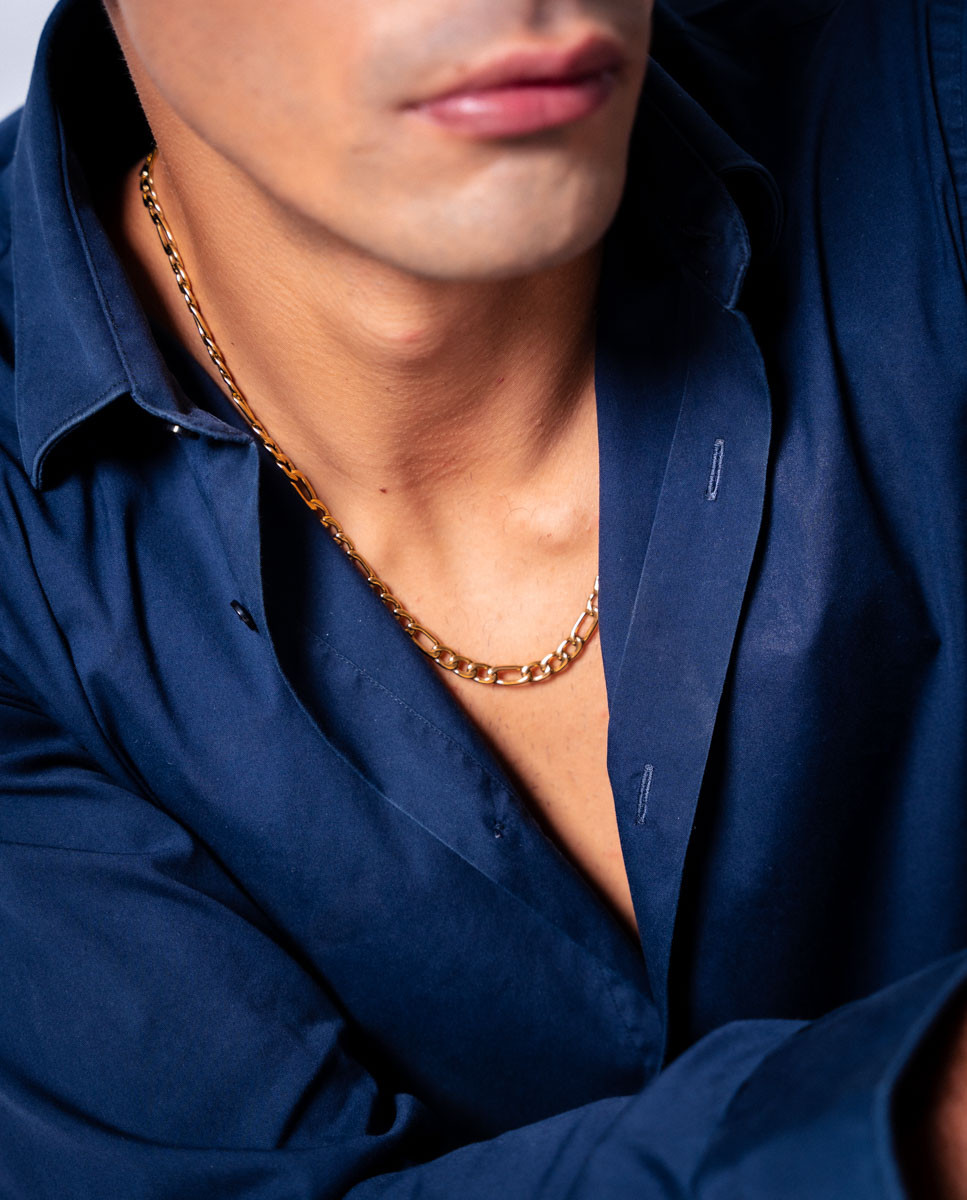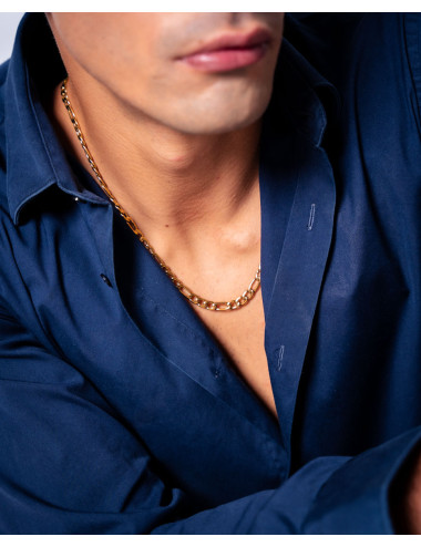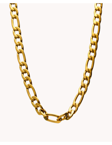 Cadena de acero inoxidable bañado en oro con eslabón tipo cartier de 5 mm de ancho, cierre de mosquetón y largo de 50 cms más 3,5 cms de alargador.