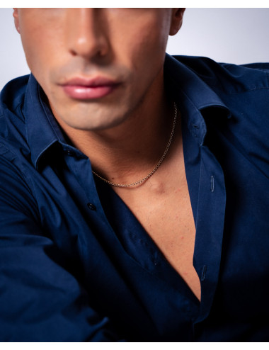 Cadena de plata de ley 925 bañada en oro de 18K con eslabón tipo barbado de 3 mm de ancho y 45 cms de largo, cierre de mosquetón.
