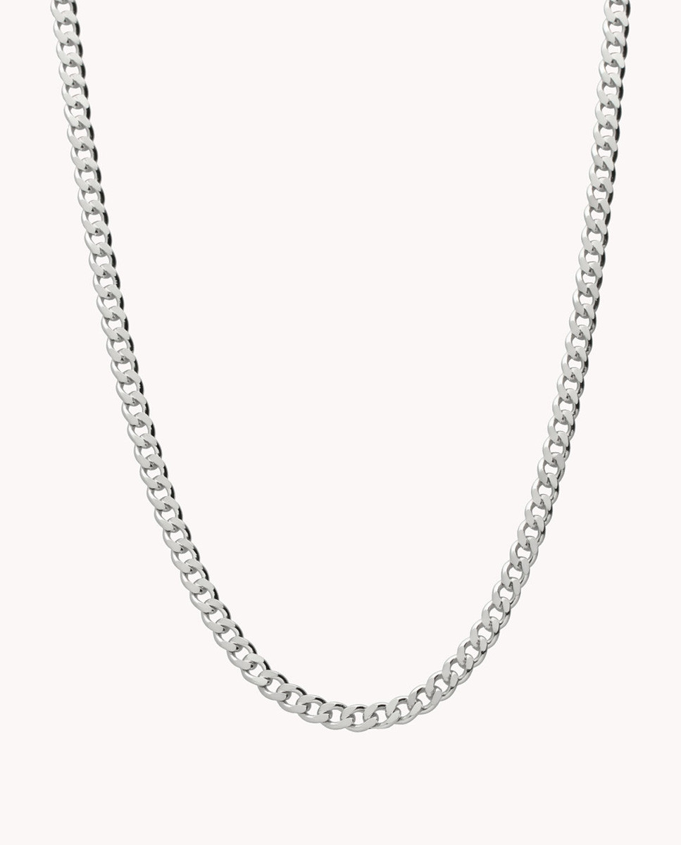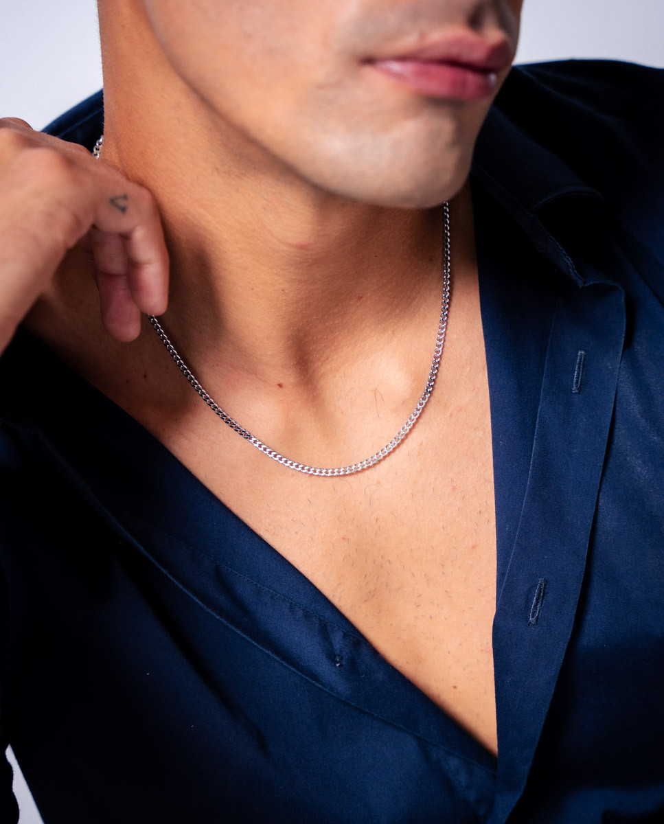 Cadena de plata de ley 925 bañada en rodio con eslabón tipo barbado de 3 mm de ancho y 50 cms de largo, cierre de mosquetón.